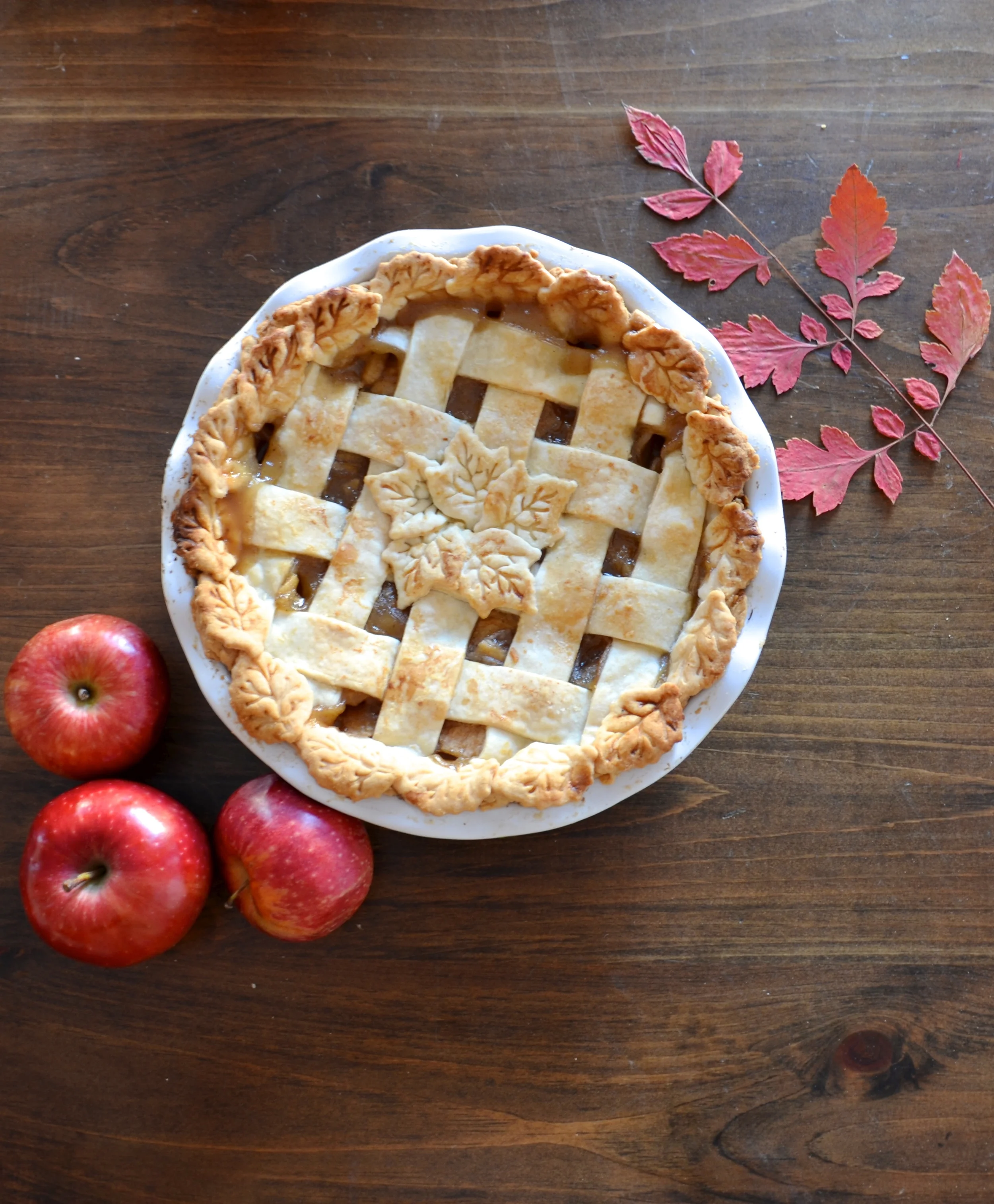 This part can be optional, but I think it adds the cutest final touch and is the perfect way to achieve a festive fall/Thanksgiving theme! Use one final sheet of dough to cut out leaves for the crust. My mom got me this set of leaf-shaped cookie cutters so I'm not sure where these particular ones are from, but I've seen similar ones at multiple home good stores. I just used 2 out of the 4 leaf designs - one around the outside of the crust and another in the middle of the pie.