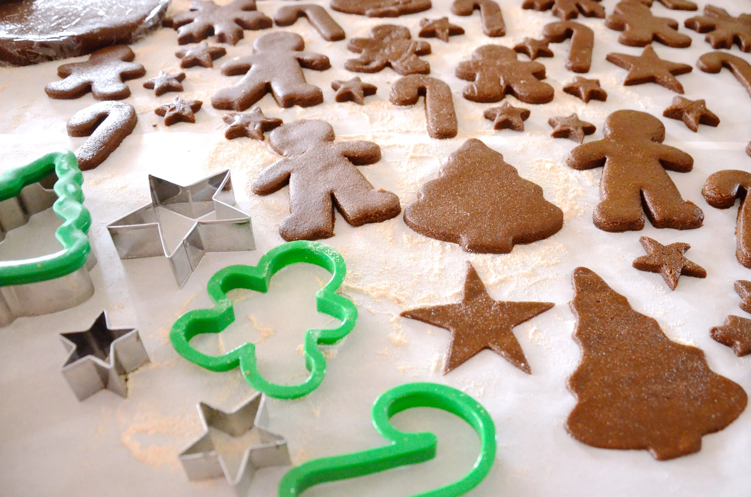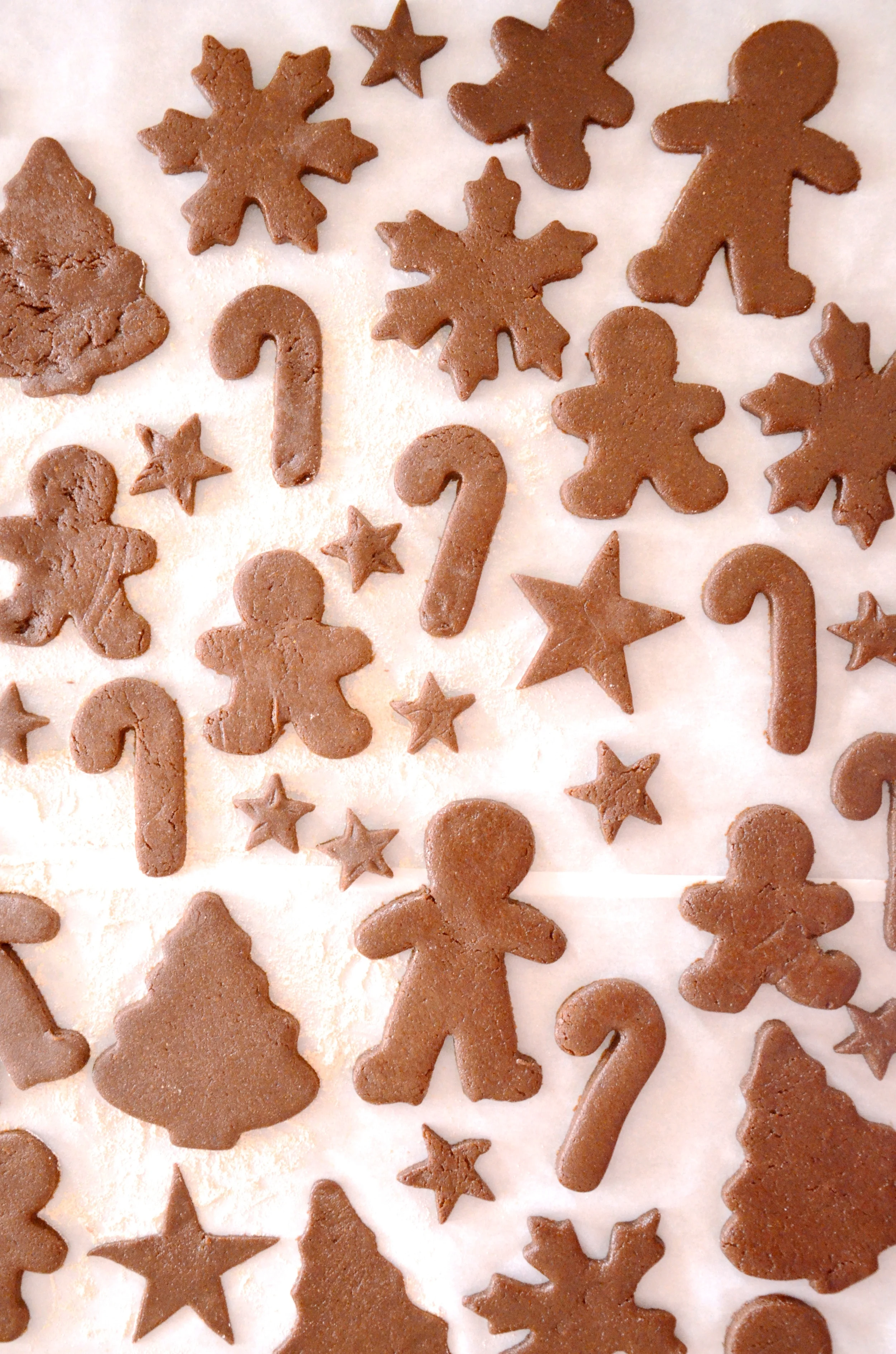 Using any cookie cutters of your choice, begin to cut out shapes with the rolled dough. I used gingerbread man, snowflakes, candy canes, Christmas trees, and stars.