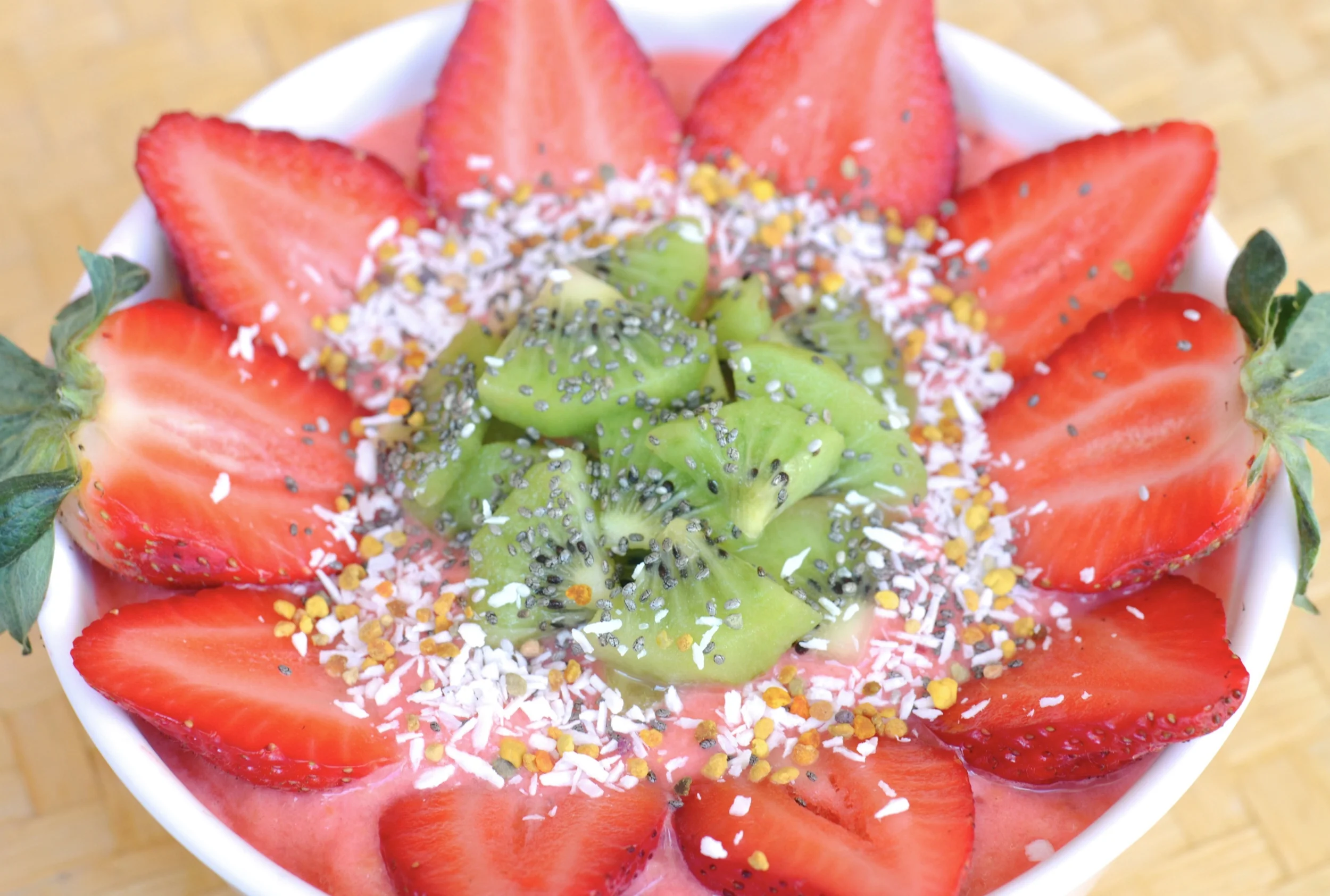 Blend all of your ingredients together and pulse until smooth. Next, pour your smoothie into a bowl. For my toppings, I first started with the strawberries. I arranged them around the perimeter of the bowl, added my kiwis to the center and added a teaspoon of chia seeds on top of them, then sprinkled some shredded coconut and bee pollen on top of the remaining exposed smoothie.