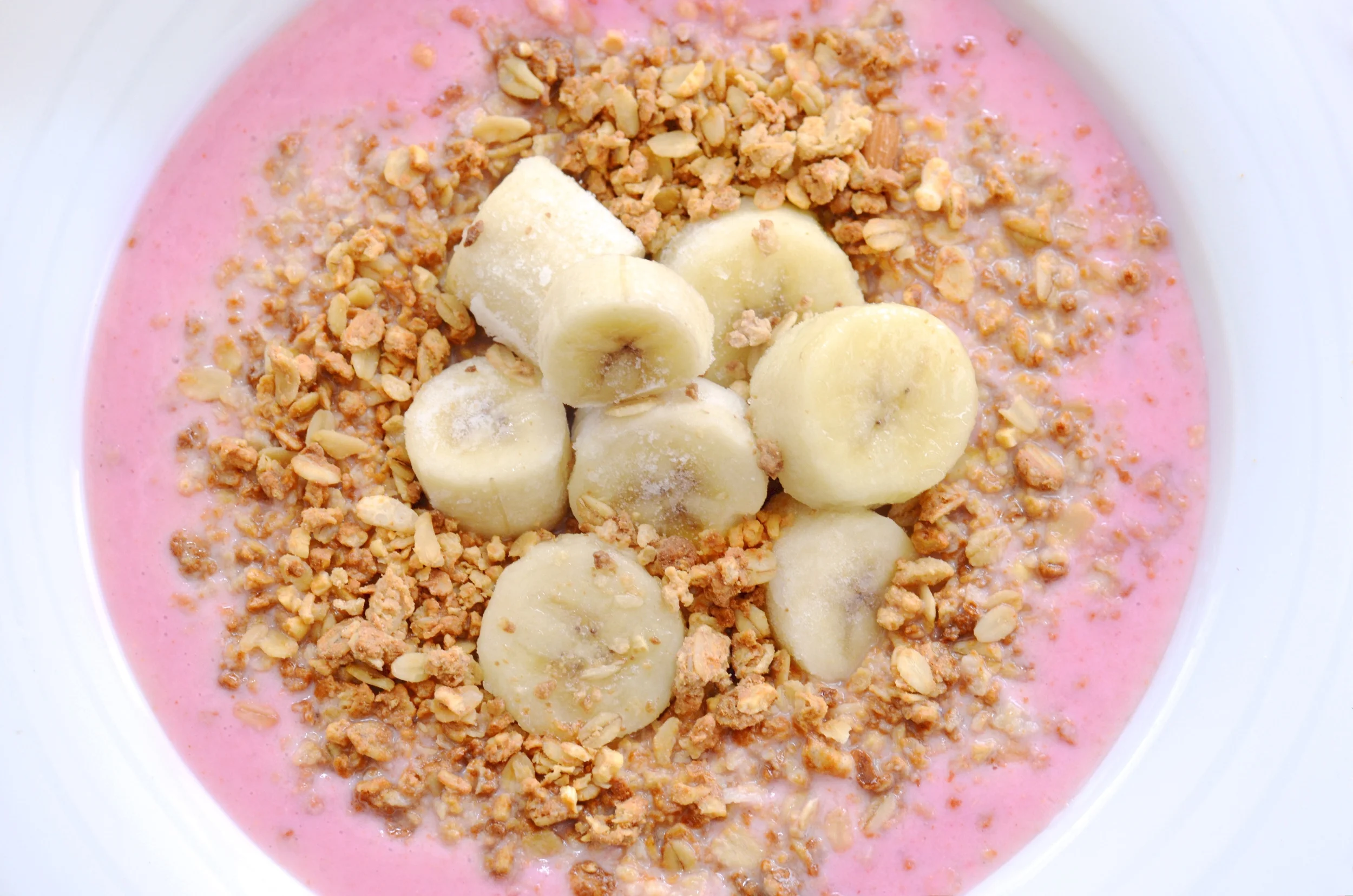 For your smoothie, simply blend all of your ingredients together until smooth. Pour your smoothie into a bowl and top it with your banana slices and granola.