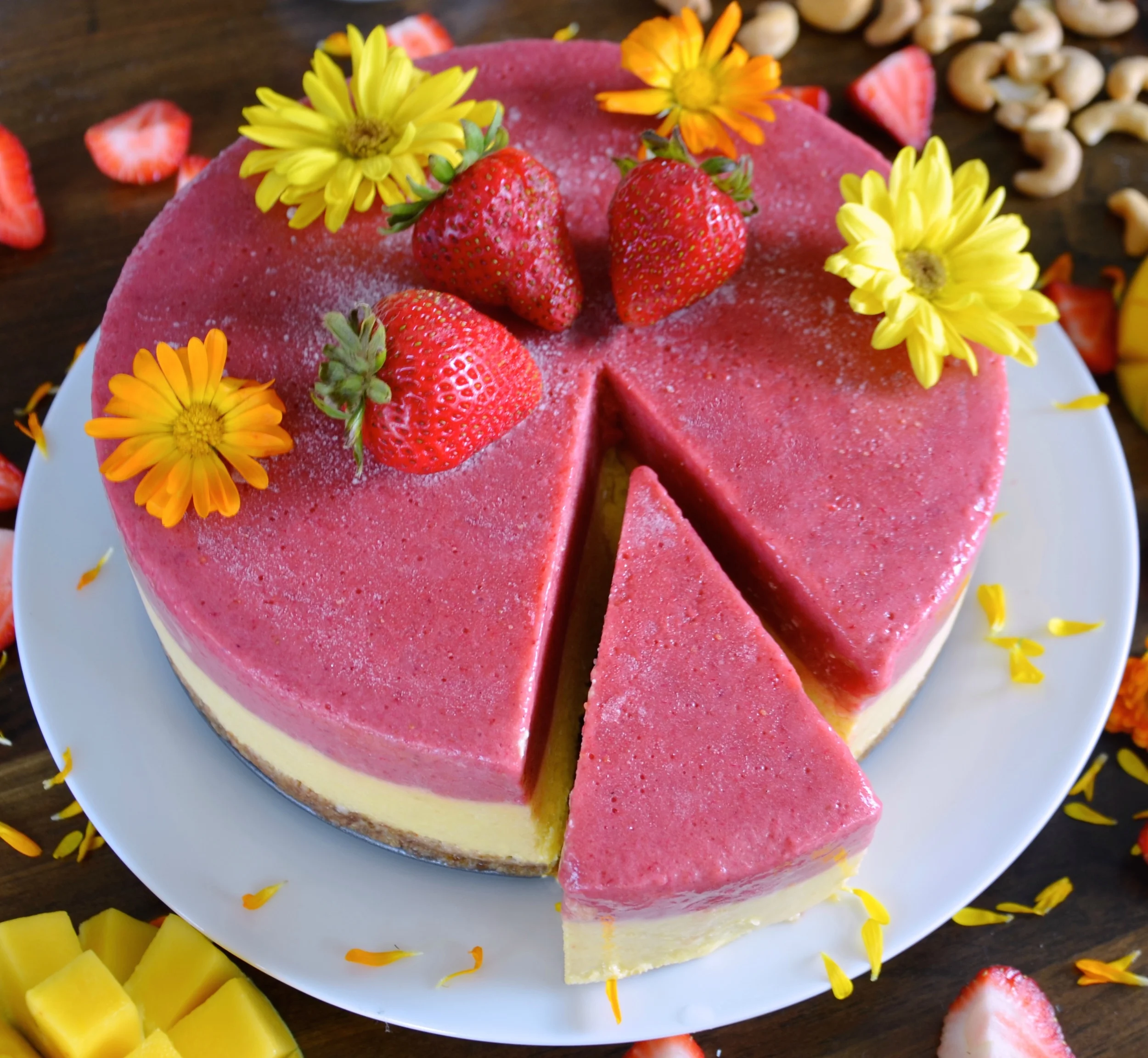 For both of your different filling flavors, simply add all of the ingredients together in a blender and pulse until smooth. I used frozen fruit for each filling, but next time I am going to use thawed or fresh fruit to achieve a more desirable final texture. Pour each filling into the pan, starting first with the mango filing on top of the base and following it with the strawberry filling. Cover your cake with plastic wrap and place the pan in a freezer, letting it freeze until it is solid all the way through (I just left mine in there until I woke up in the morning... ya know, since I made this at 12 AM).