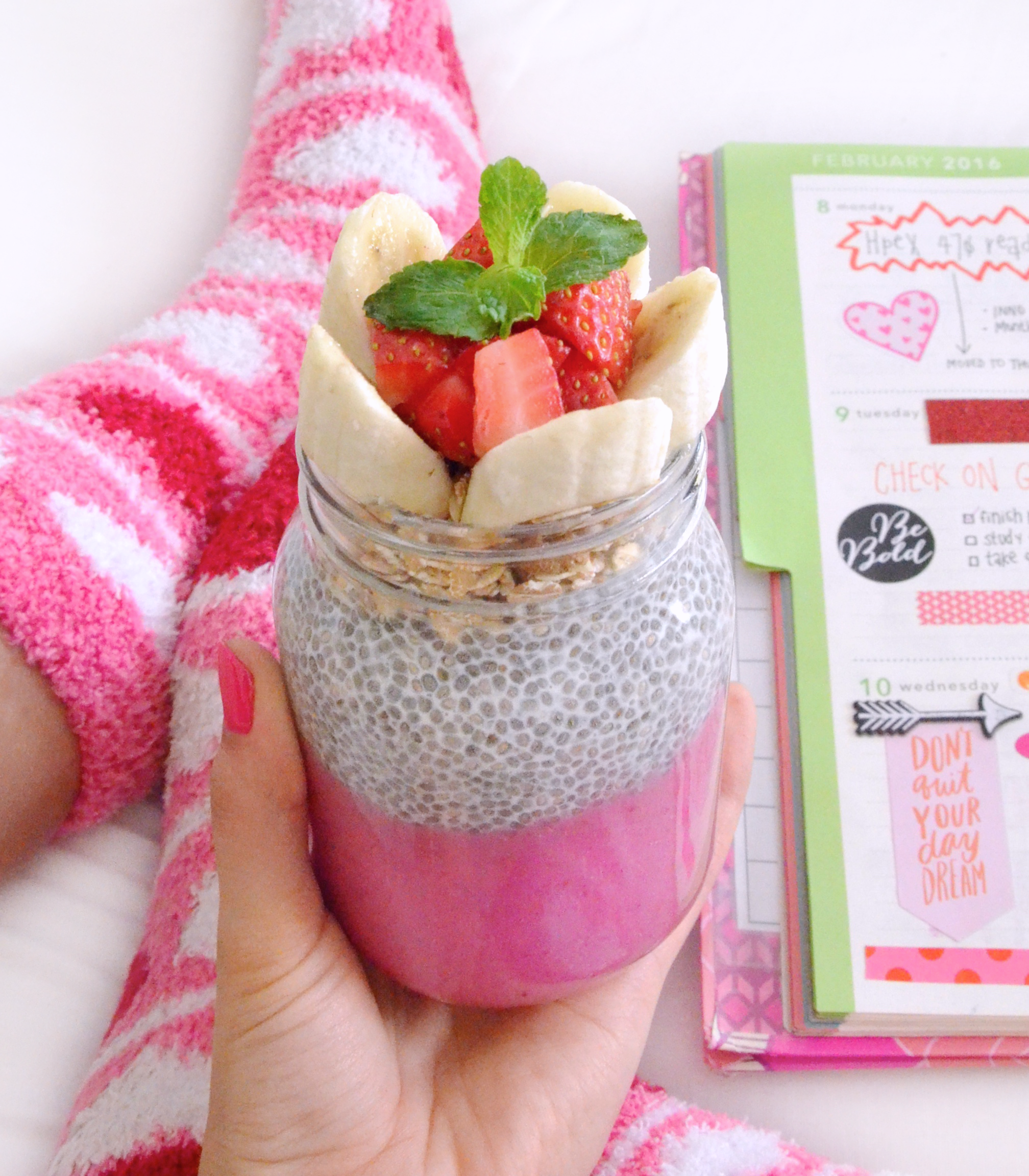 For the smoothie, simply add all of the ingredients to a high-speed food processor or blender and pulse until smooth. To put it all together, start off by adding a layer of smoothie to a jar, followed by a layer of chia pudding and muesli and garnish it with strawberries, bananas, and mint leaves.