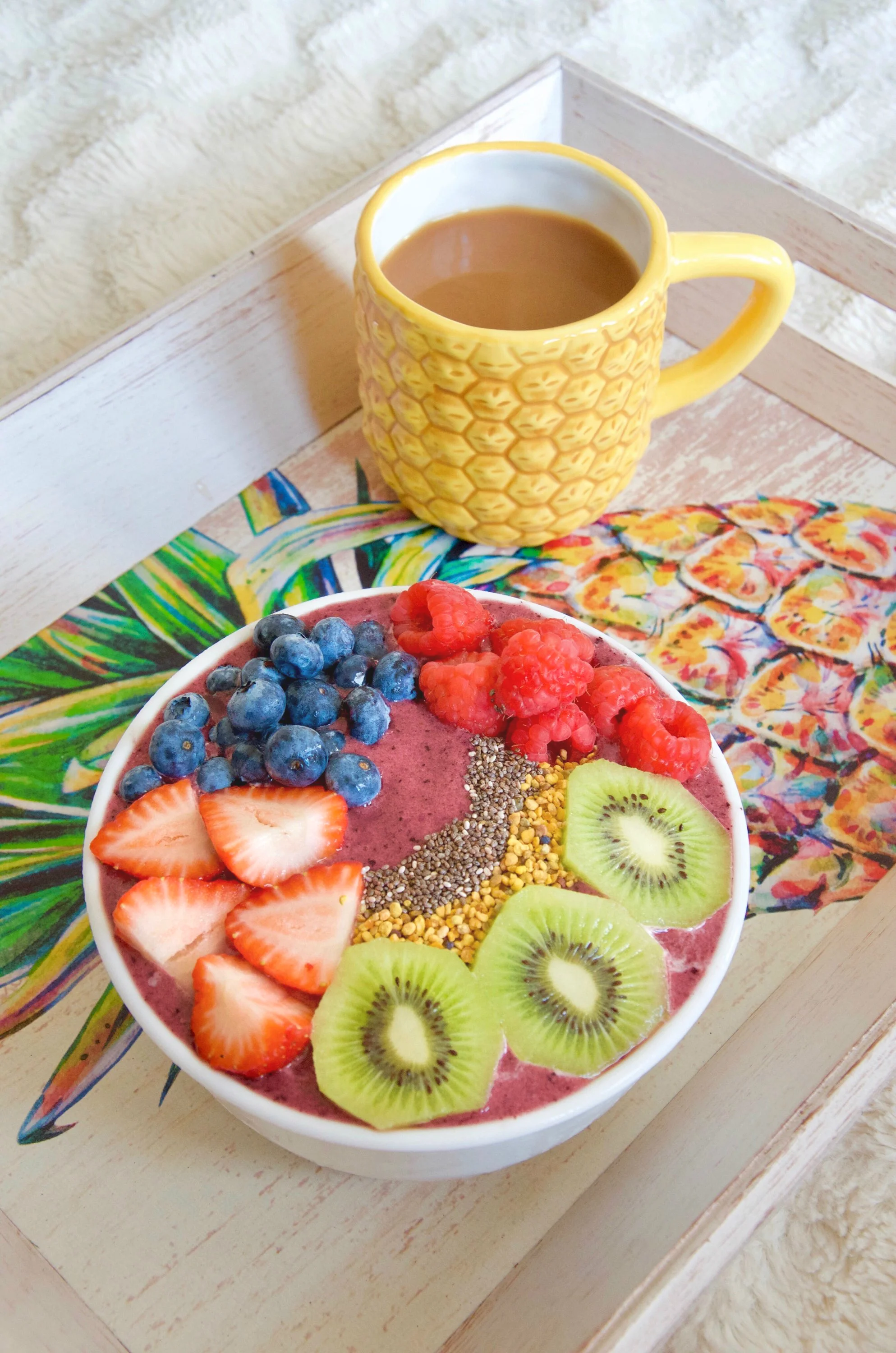 Begin by preparing your smoothie. Add all of the ingredients to a high-speed food processor or blender and pulse until smooth. To assemble the smoothie bowl, begin by pouring the smoothie into a bowl. I added strawberries, blueberries, raspberries, kiwis, bee pollen, and chia seeds on top.