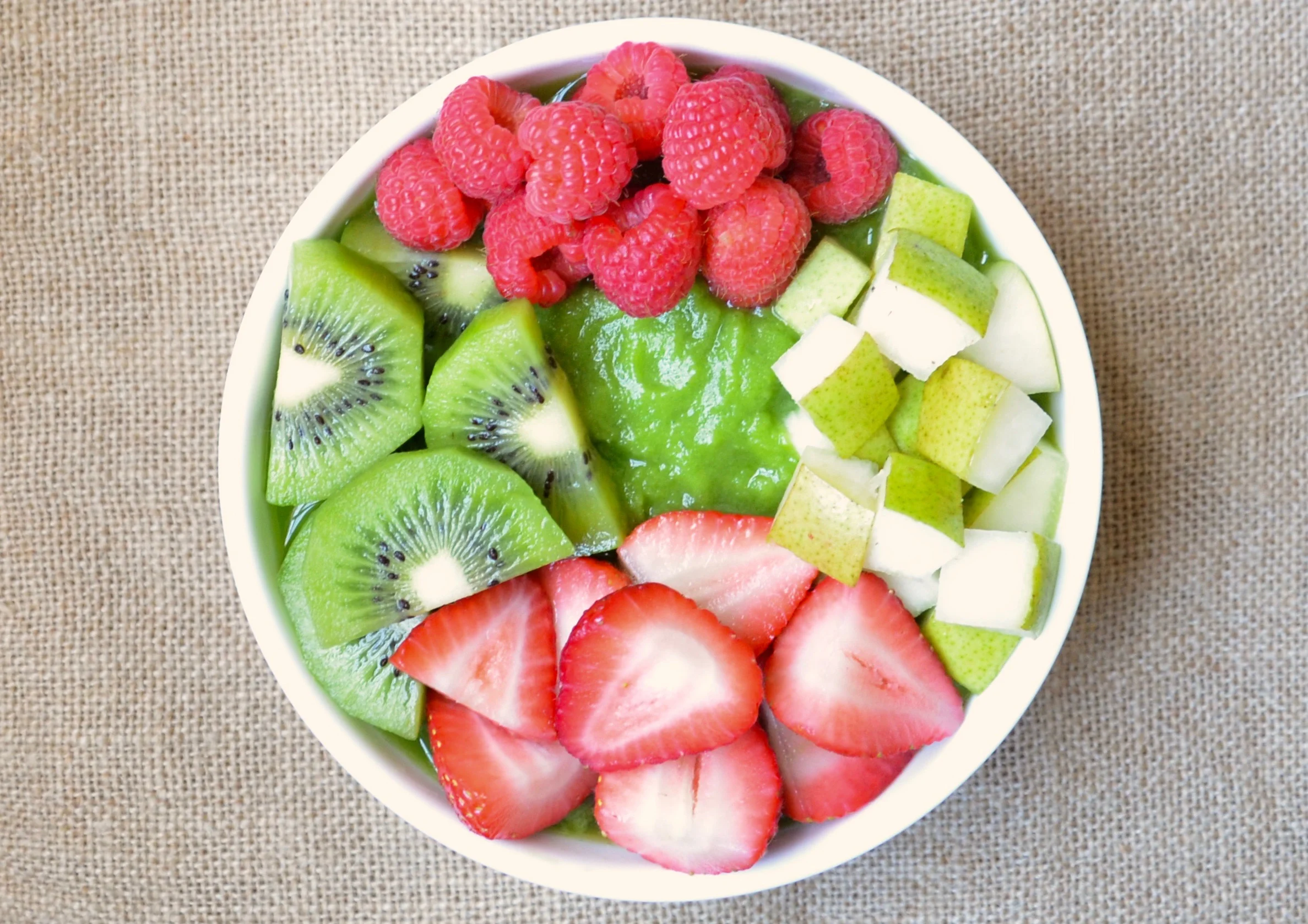 Begin by blending the spinach and almond milk in a blender and pulse until smooth. Next, add the rest of the fruit followed by the ground ginger, and again pulse until smooth. Once the smoothie is ready, pour it into a bowl and add the toppings! I used fresh strawberries, kiwis, raspberries, and pears.
