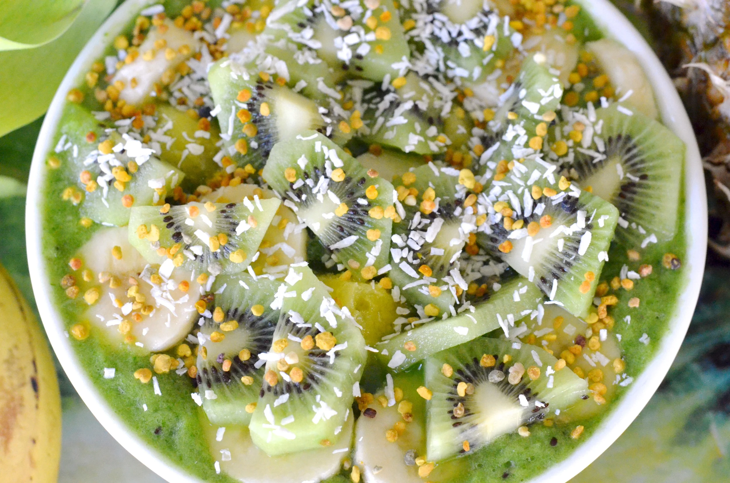 To assemble the smoothie bowl, begin by pouring the smoothie into a bowl. I added a layer of pineapples followed by a layer of bananas, kiwis, shredded coconut, and bee pollen.