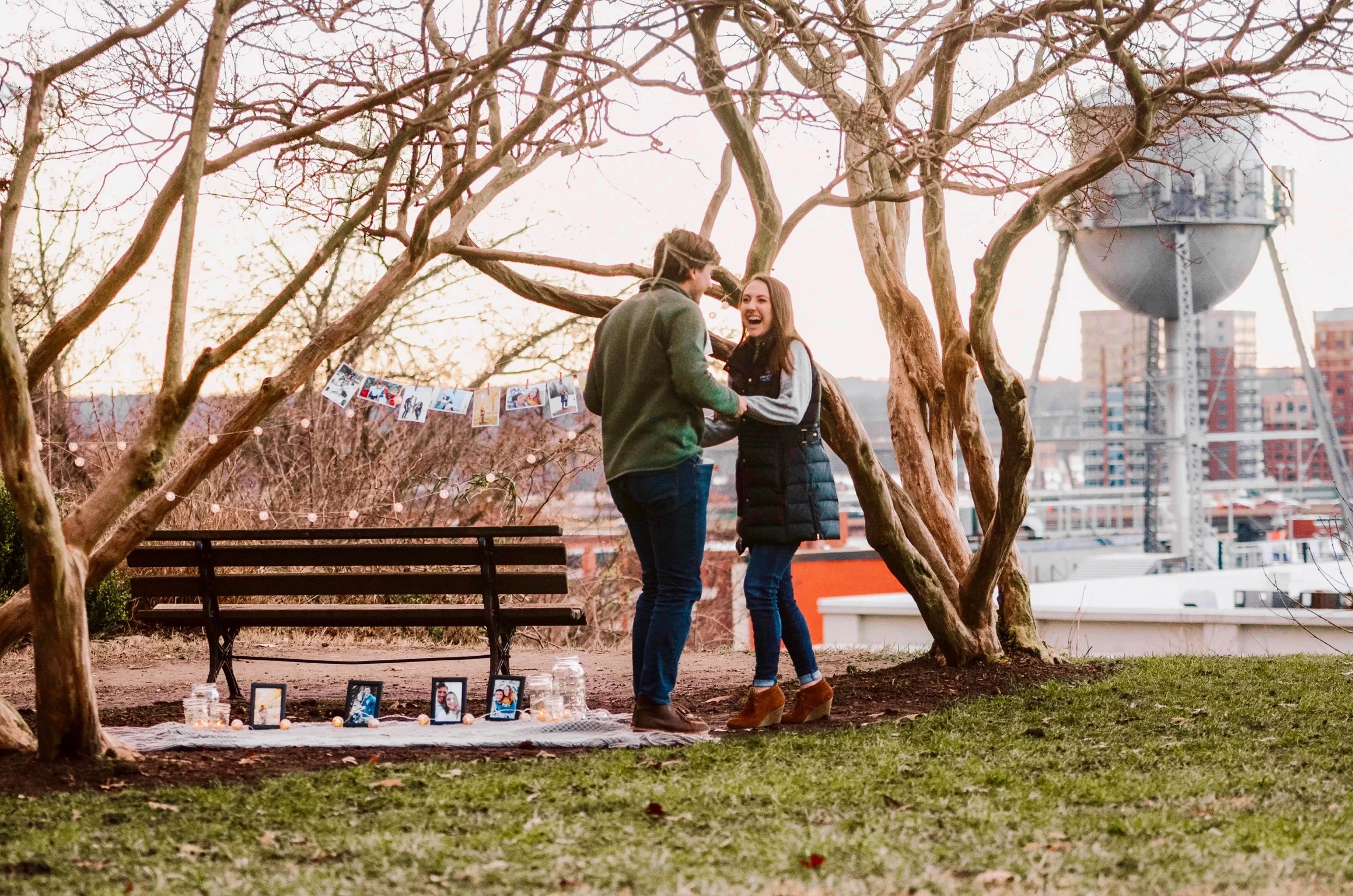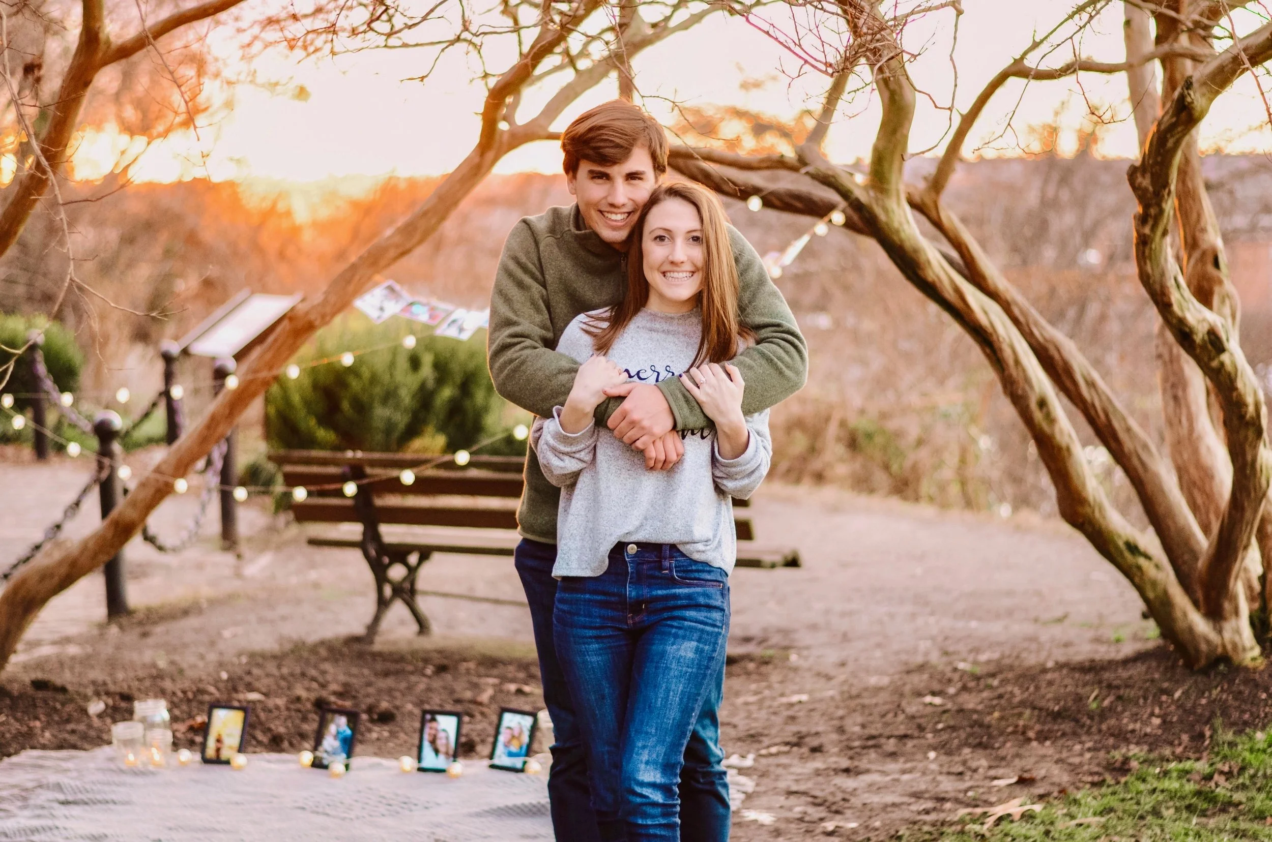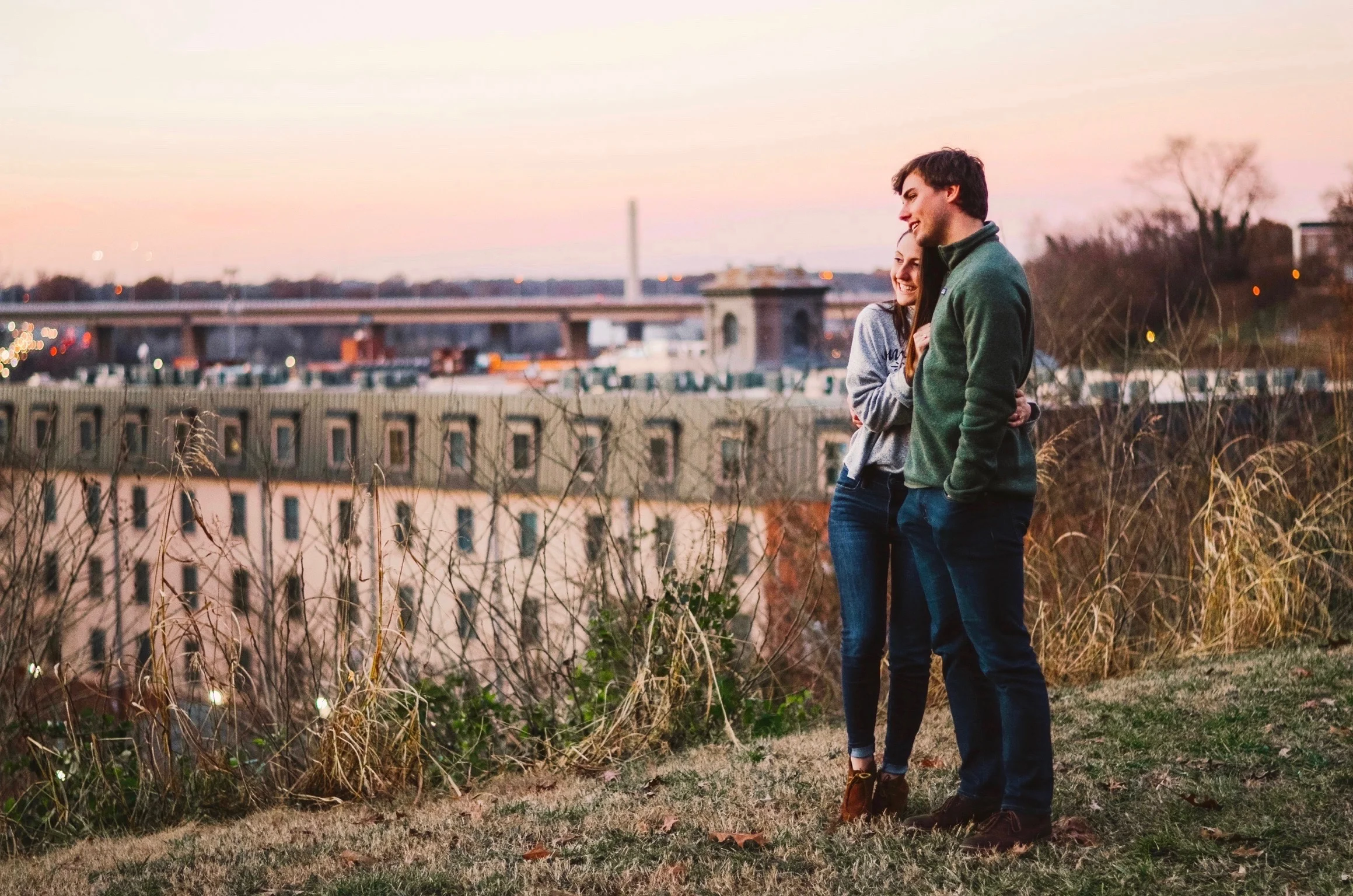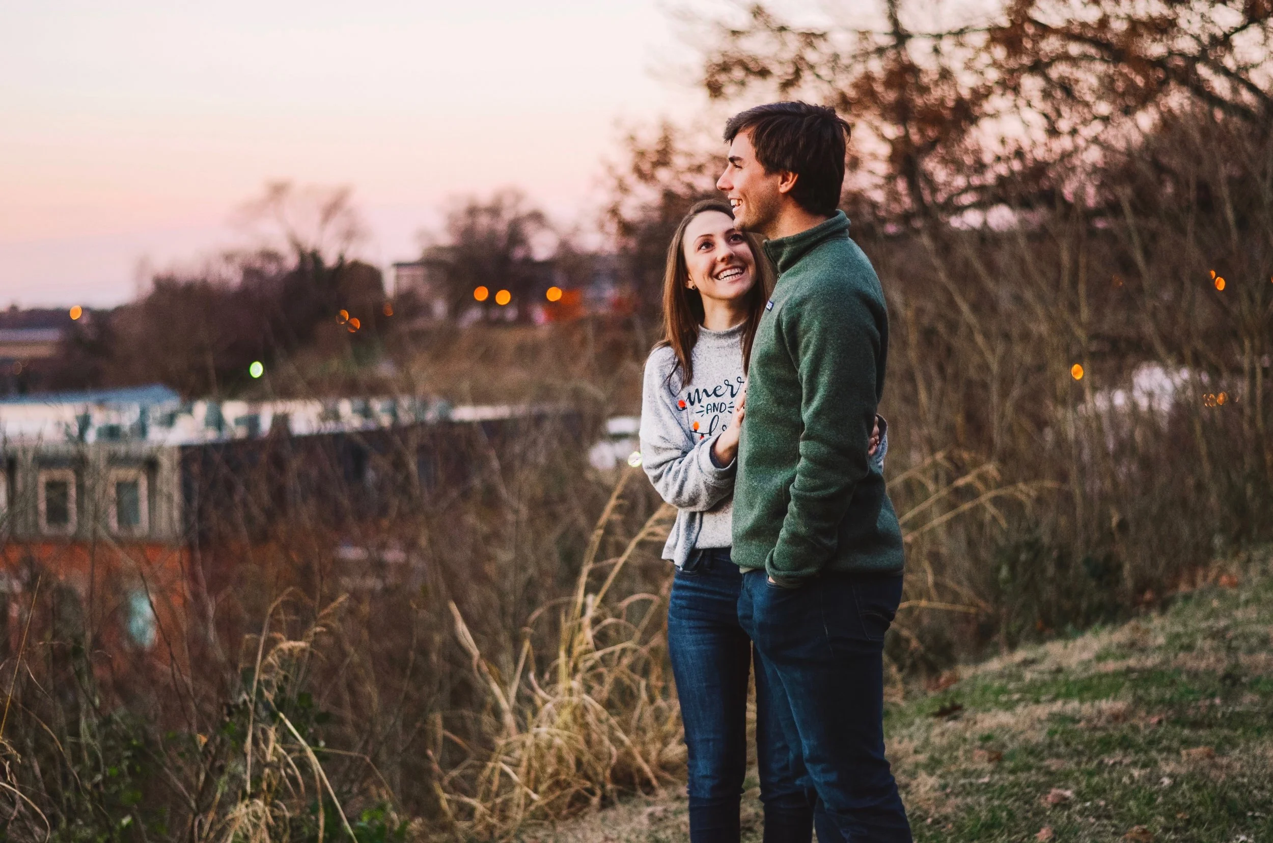 Austin and I drove up to Richmond, VA for the day where he would eventually propose to his soulmate. Emily was already there visiting her friend, Erica, and had no idea that the proposal would be happening… or that Austin was even in the same city as her! P.S. Erica is the real MVP for helping us make this happen!! Austin chose the Church Hill Overlook as the spot for the magic to happen. It was secluded, romantic, and had a gorgeous view overlooking Richmond. The sun was beginning to set, which filled the sky with so many dreamy colors. Talk about a perfect winter evening at the most amazing spot!