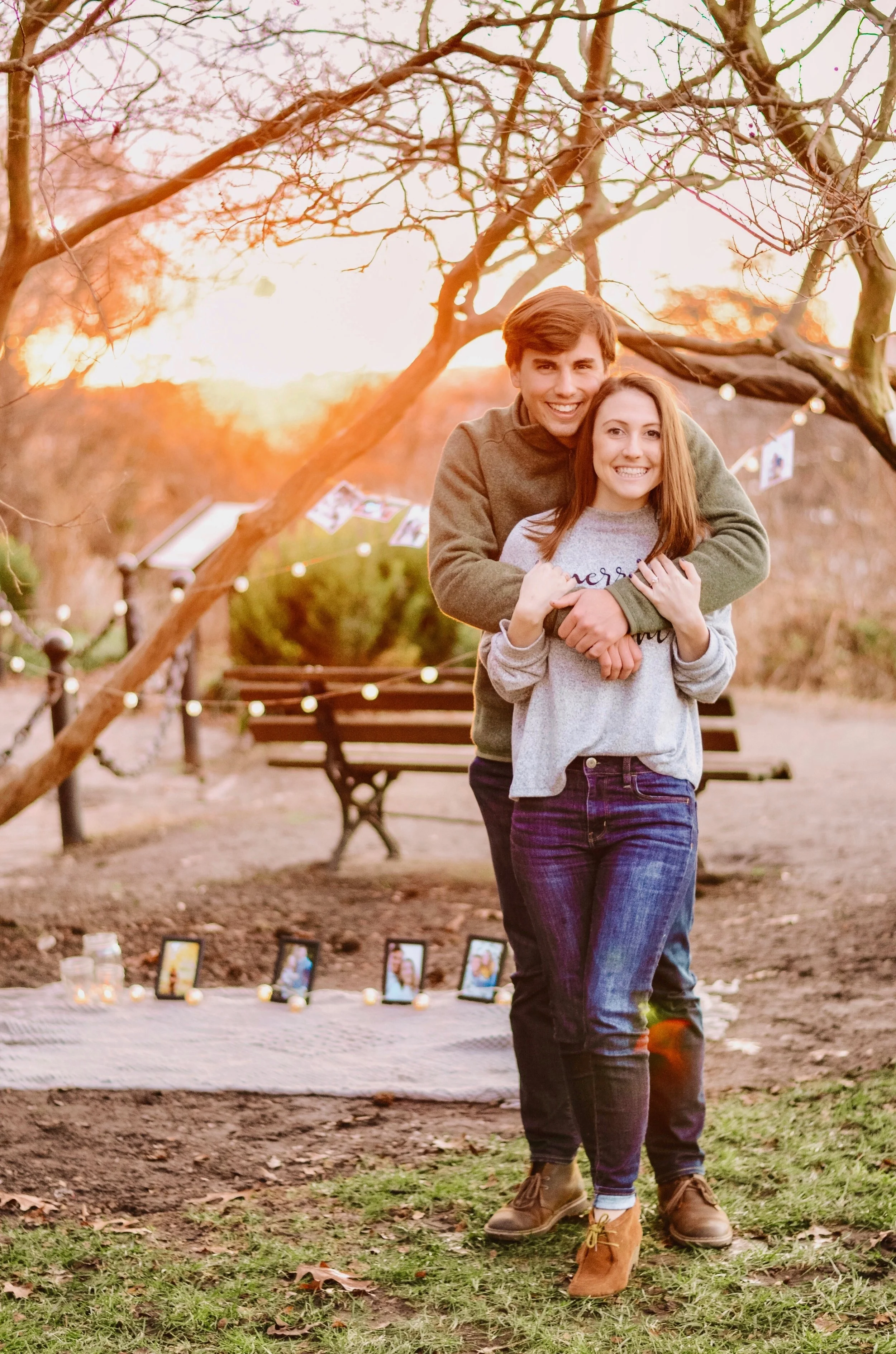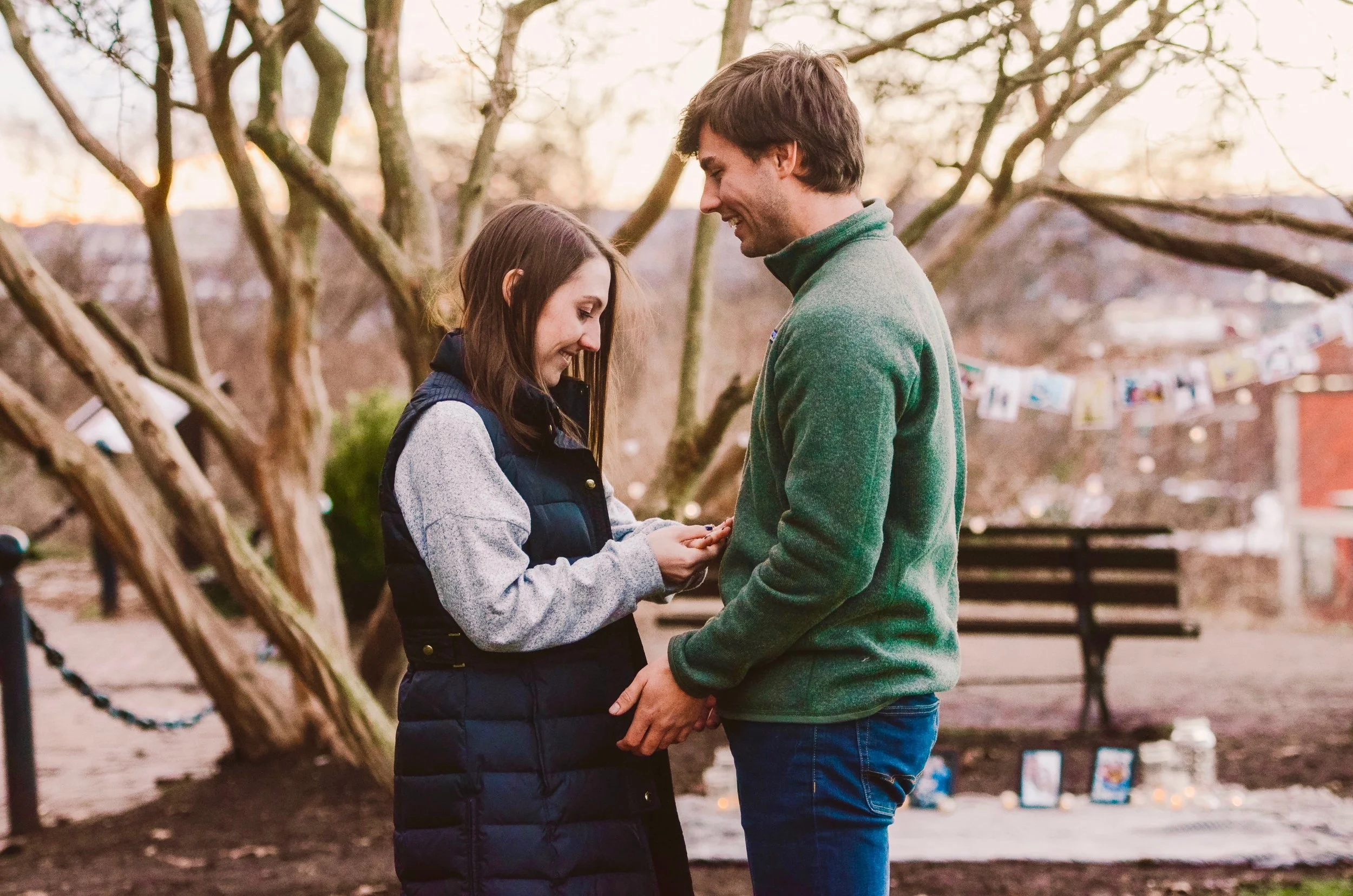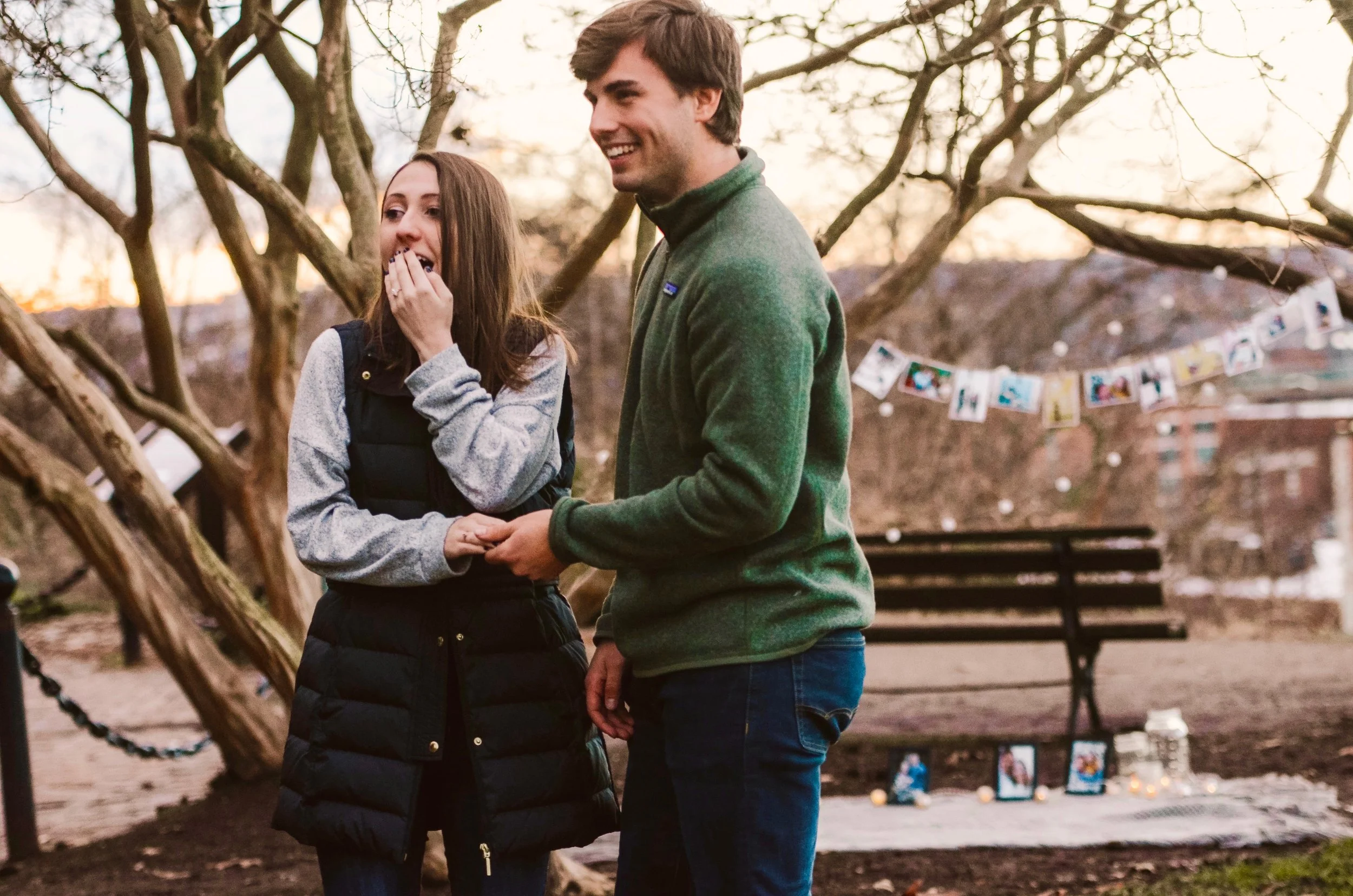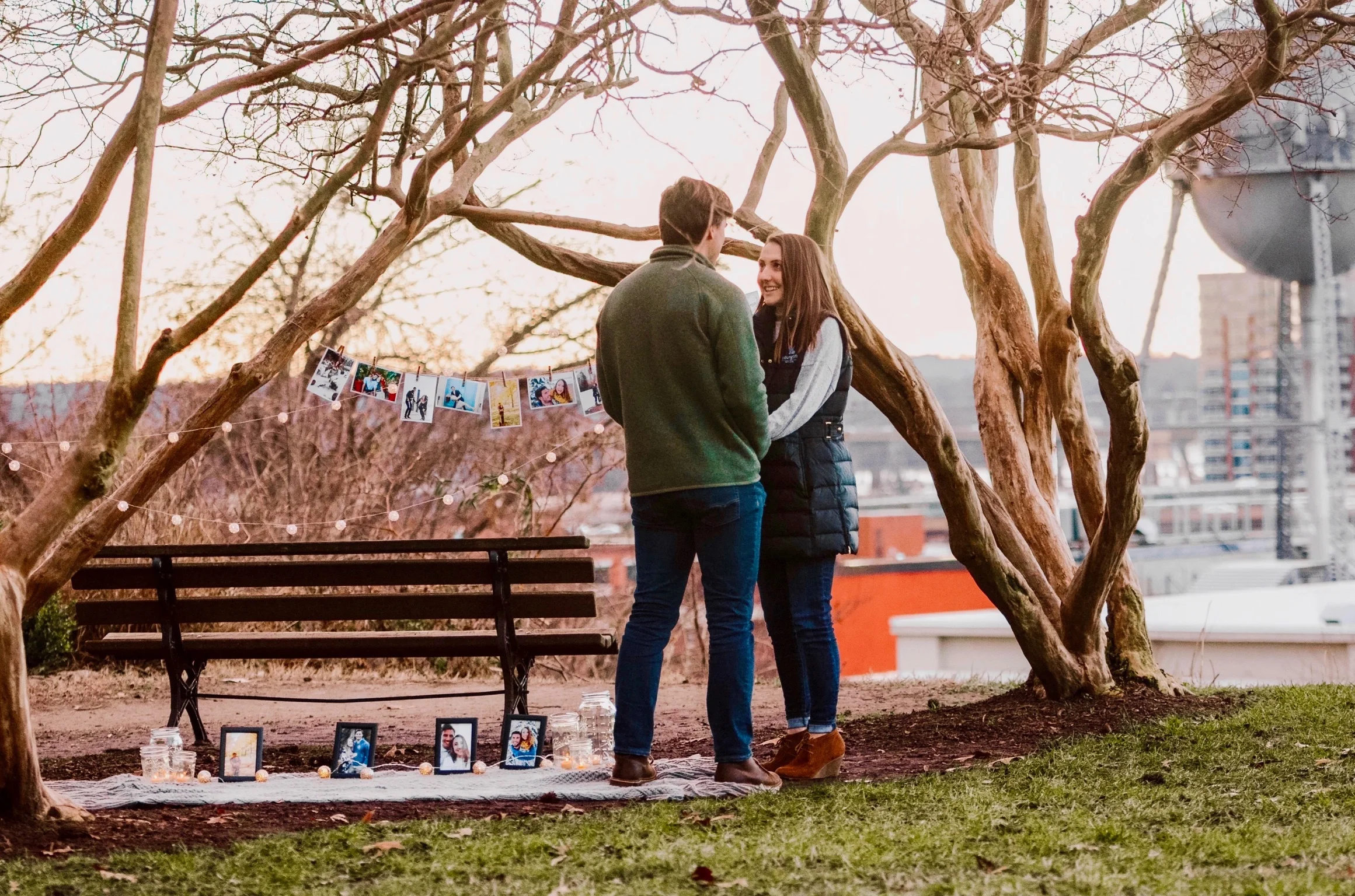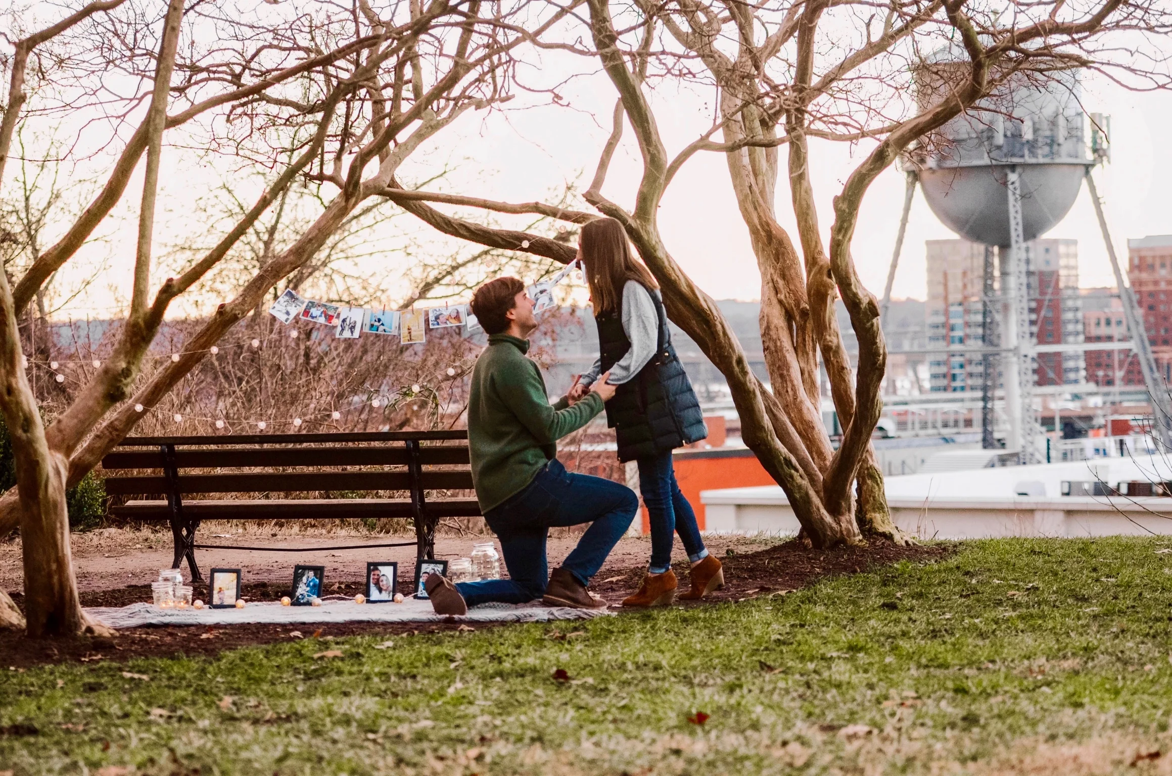Austin and I drove up to Richmond, VA for the day where he would eventually propose to his soulmate. Emily was already there visiting her friend, Erica, and had no idea that the proposal would be happening… or that Austin was even in the same city as her! P.S. Erica is the real MVP for helping us make this happen!! Austin chose the Church Hill Overlook as the spot for the magic to happen. It was secluded, romantic, and had a gorgeous view overlooking Richmond. The sun was beginning to set, which filled the sky with so many dreamy colors. Talk about a perfect winter evening at the most amazing spot!