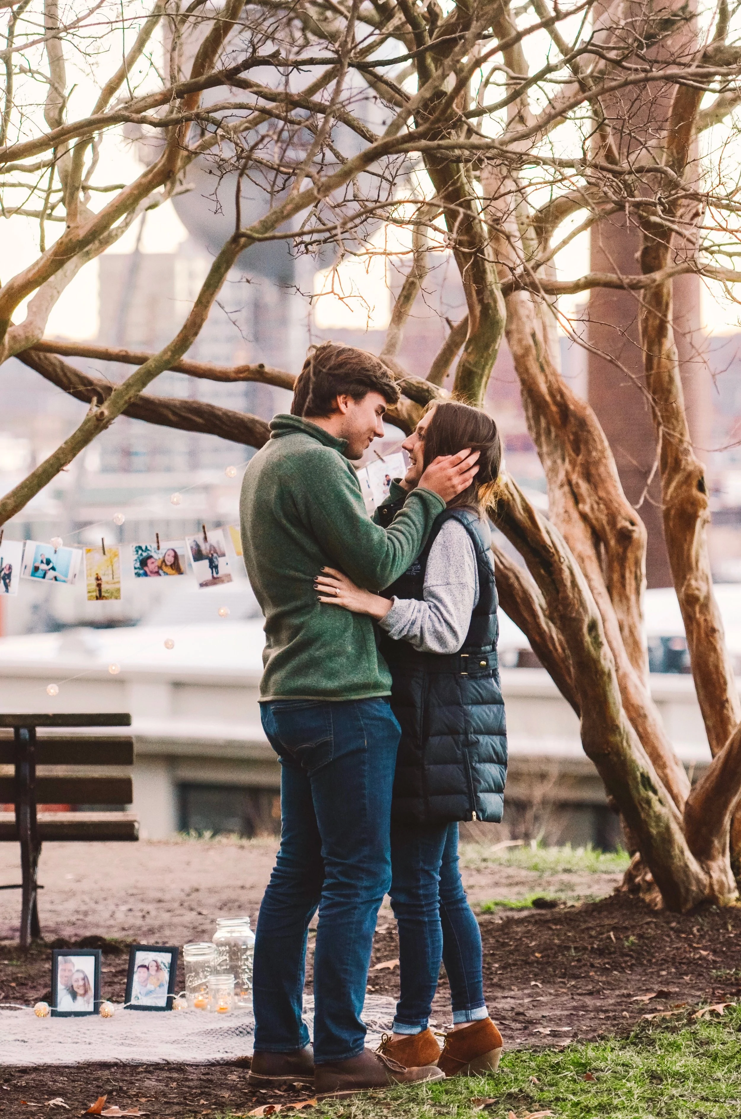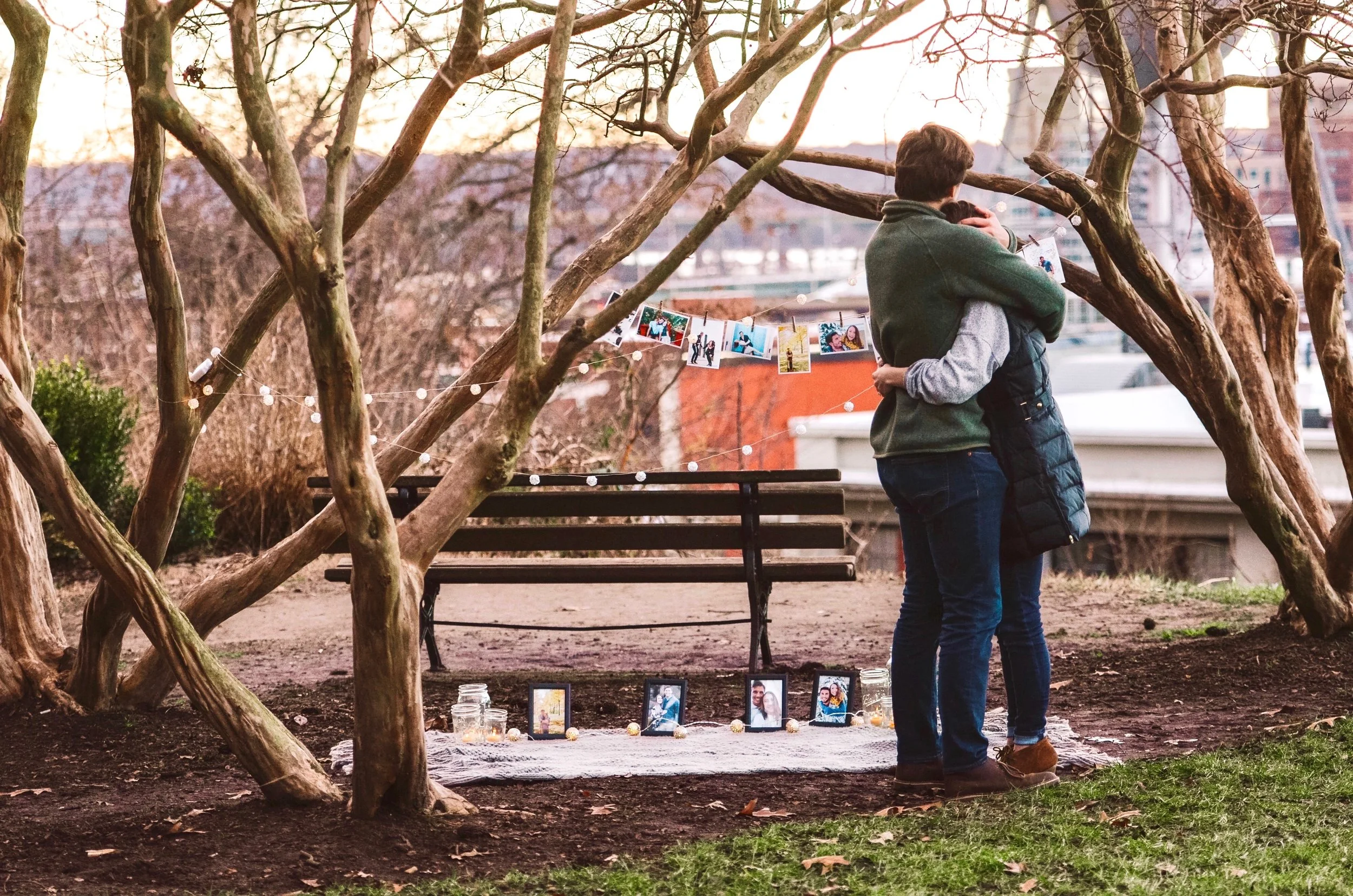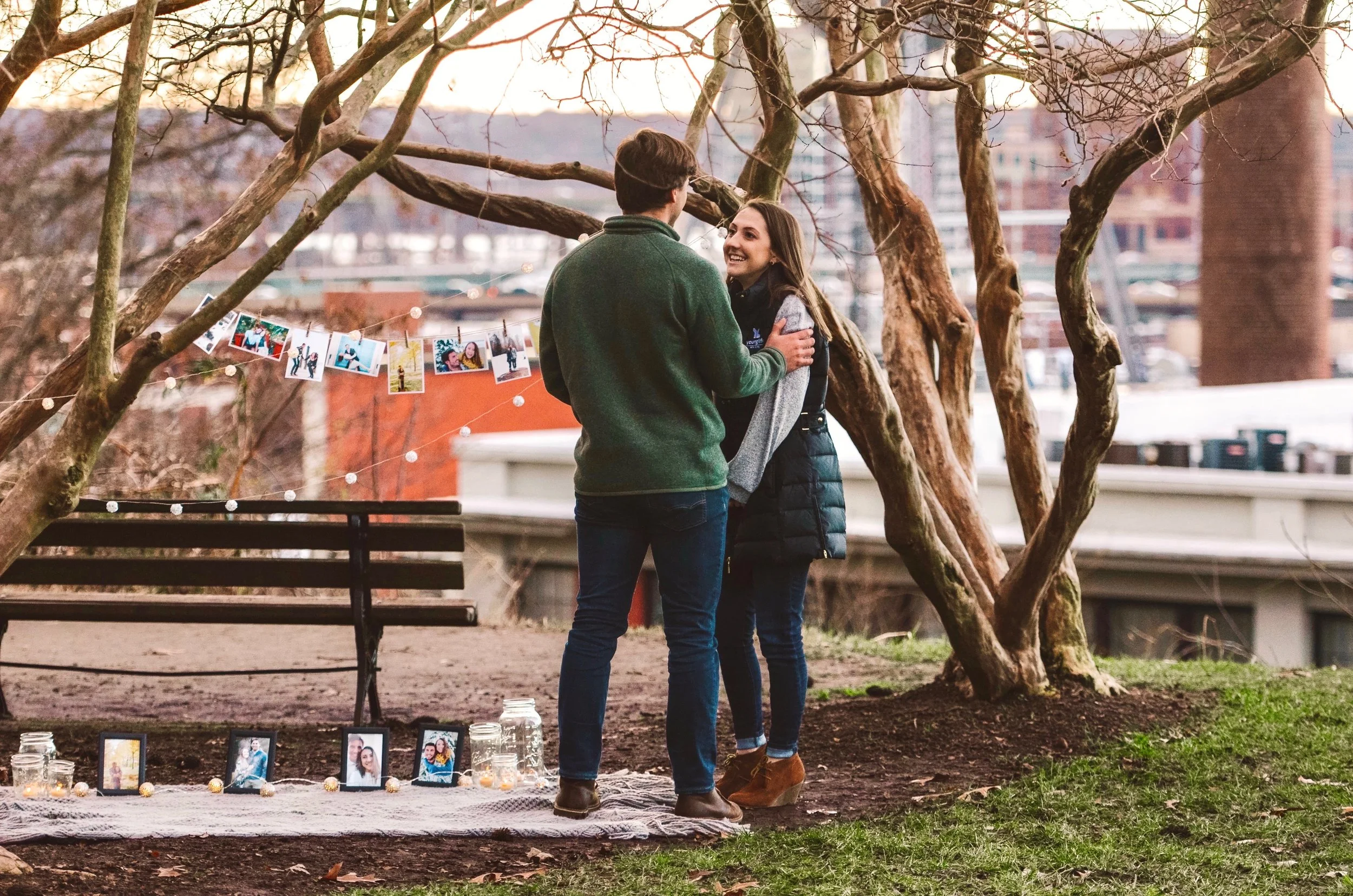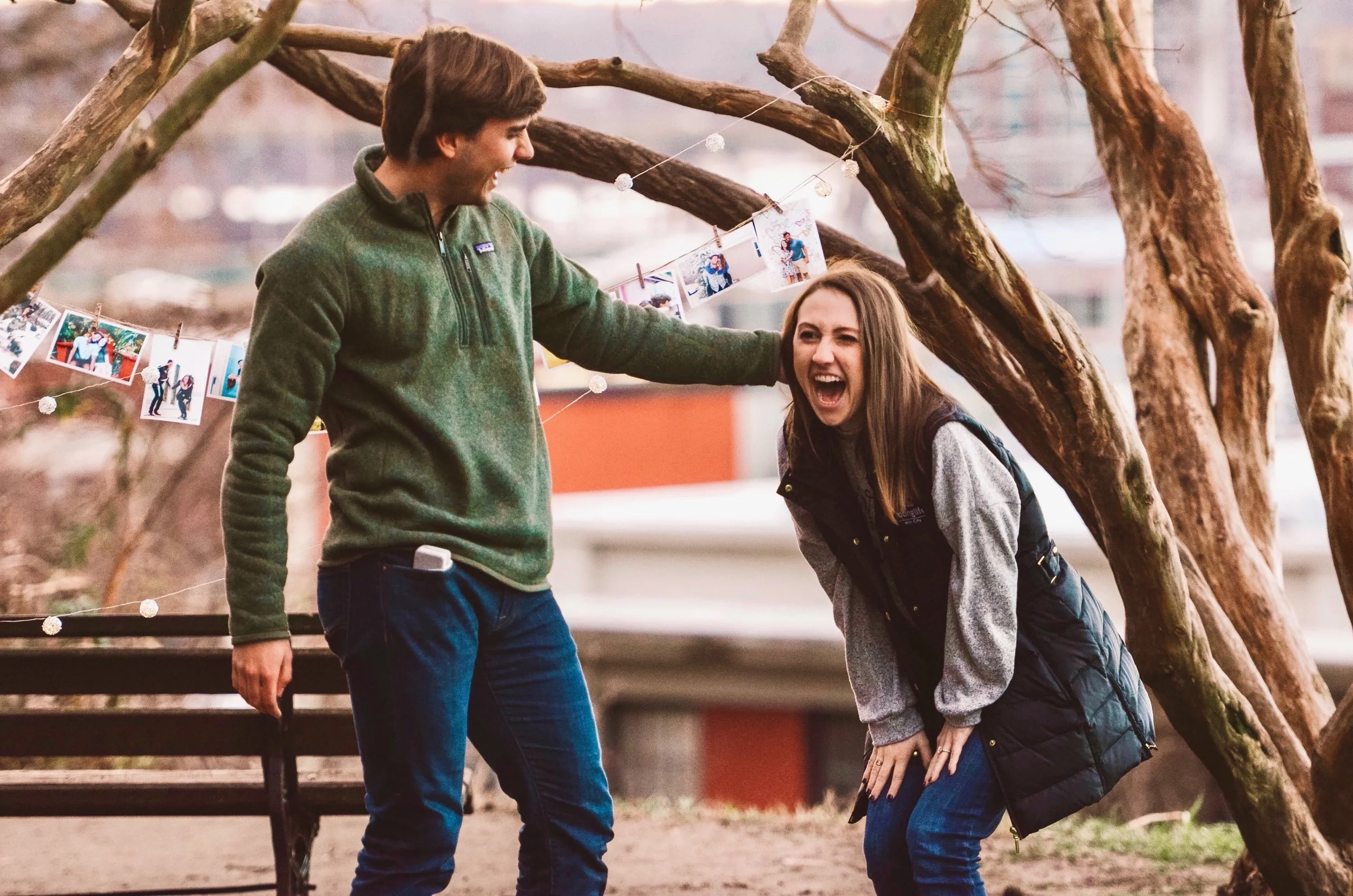 Austin and I drove up to Richmond, VA for the day where he would eventually propose to his soulmate. Emily was already there visiting her friend, Erica, and had no idea that the proposal would be happening… or that Austin was even in the same city as her! P.S. Erica is the real MVP for helping us make this happen!! Austin chose the Church Hill Overlook as the spot for the magic to happen. It was secluded, romantic, and had a gorgeous view overlooking Richmond. The sun was beginning to set, which filled the sky with so many dreamy colors. Talk about a perfect winter evening at the most amazing spot!