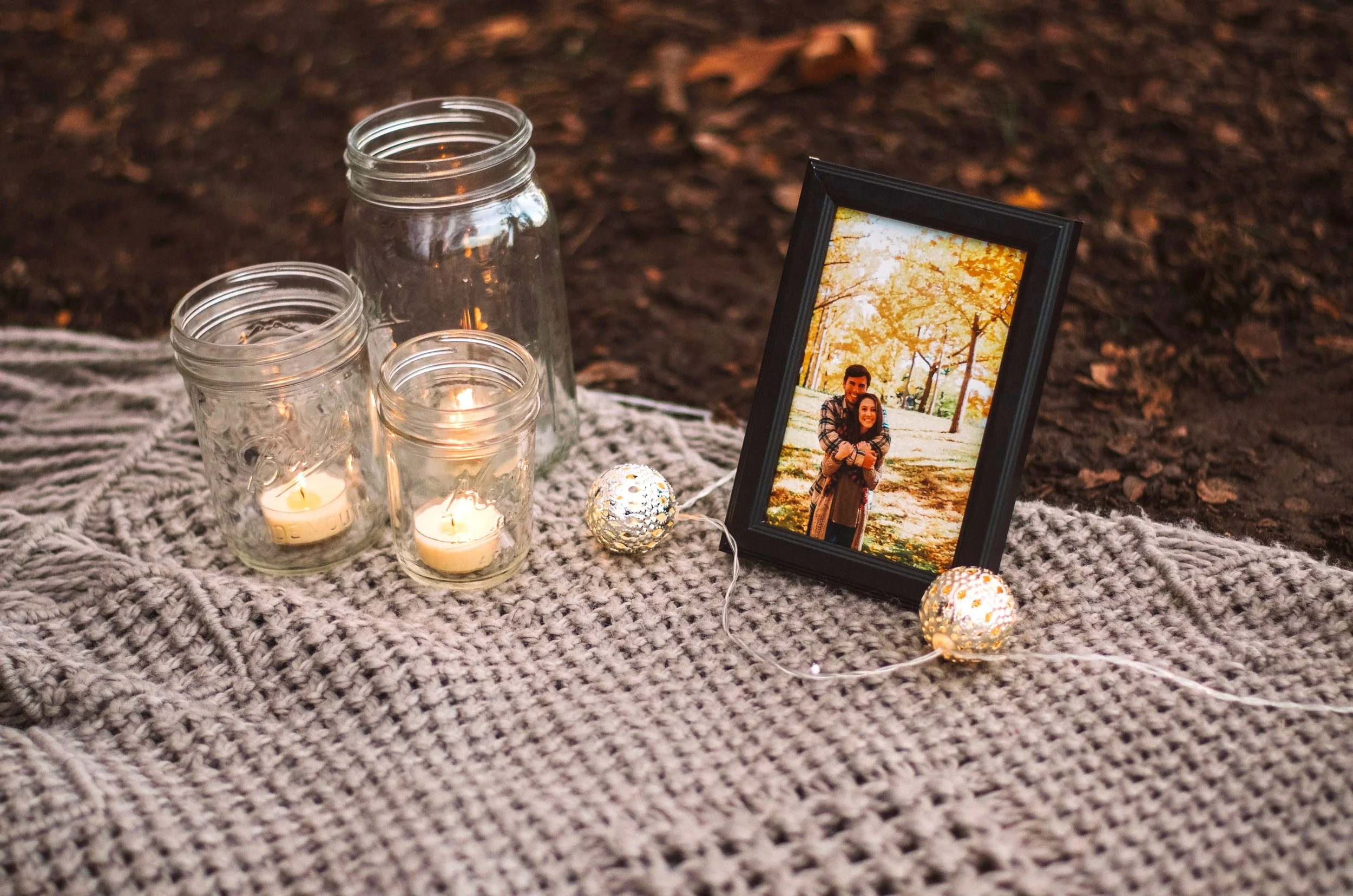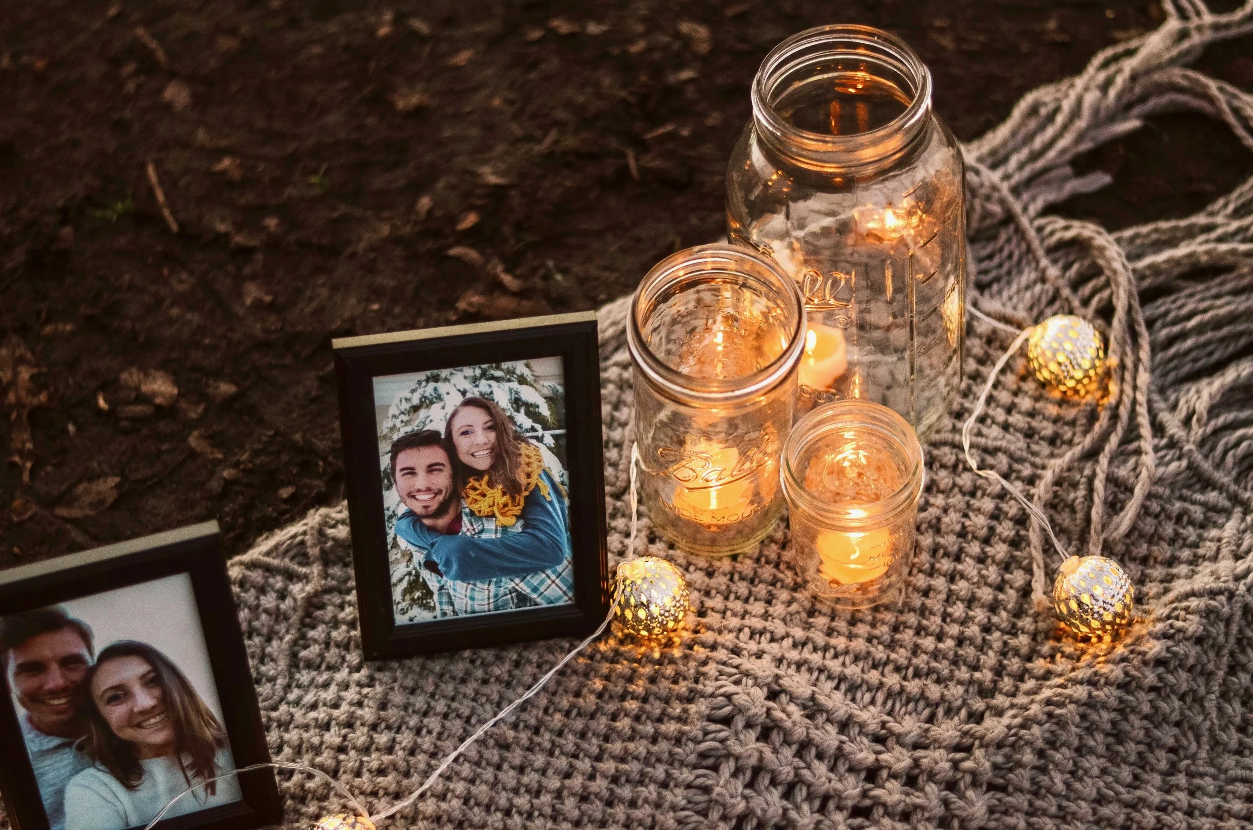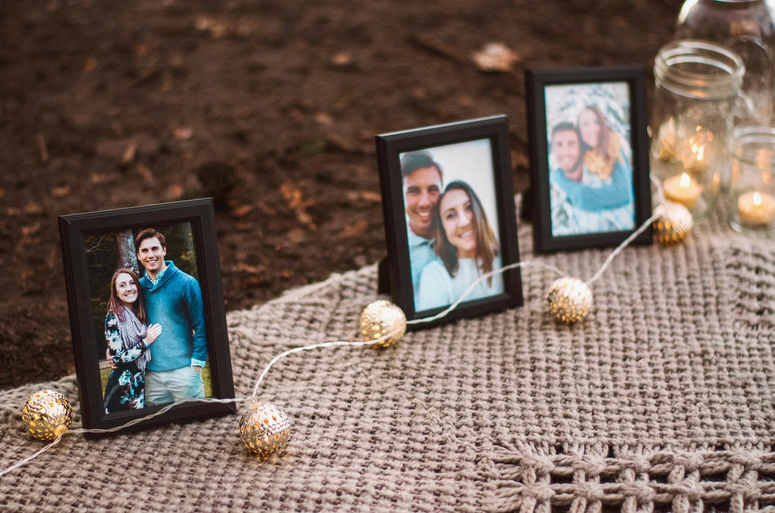 We set up shimmery string lights, *THE CUTEST* prints of Austin and Emily hanging from twine, *ALSO MORE SUPER CUTE* framed photos of Austin and Emily, mason jars with tea lights, and a cozy knit blanket. I started tearing up right away when everything was all set up - it was just so beautiful and Austin’s face beamed with pure joy and proudness.
