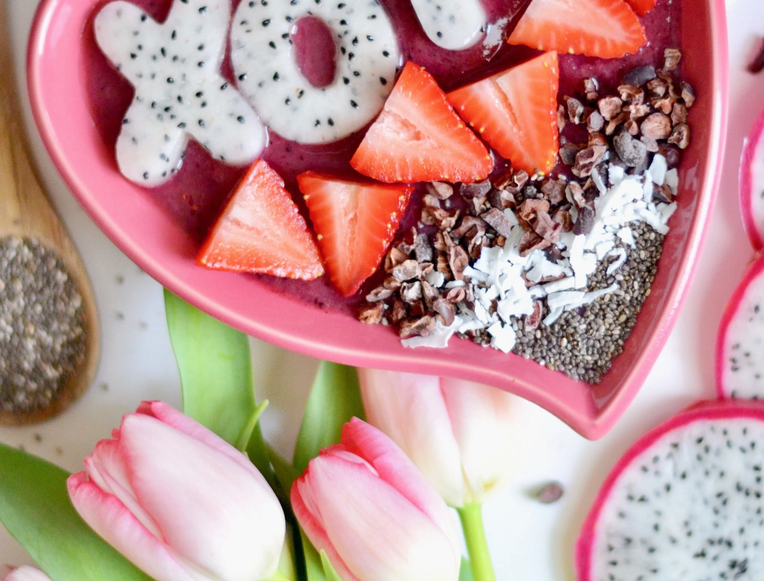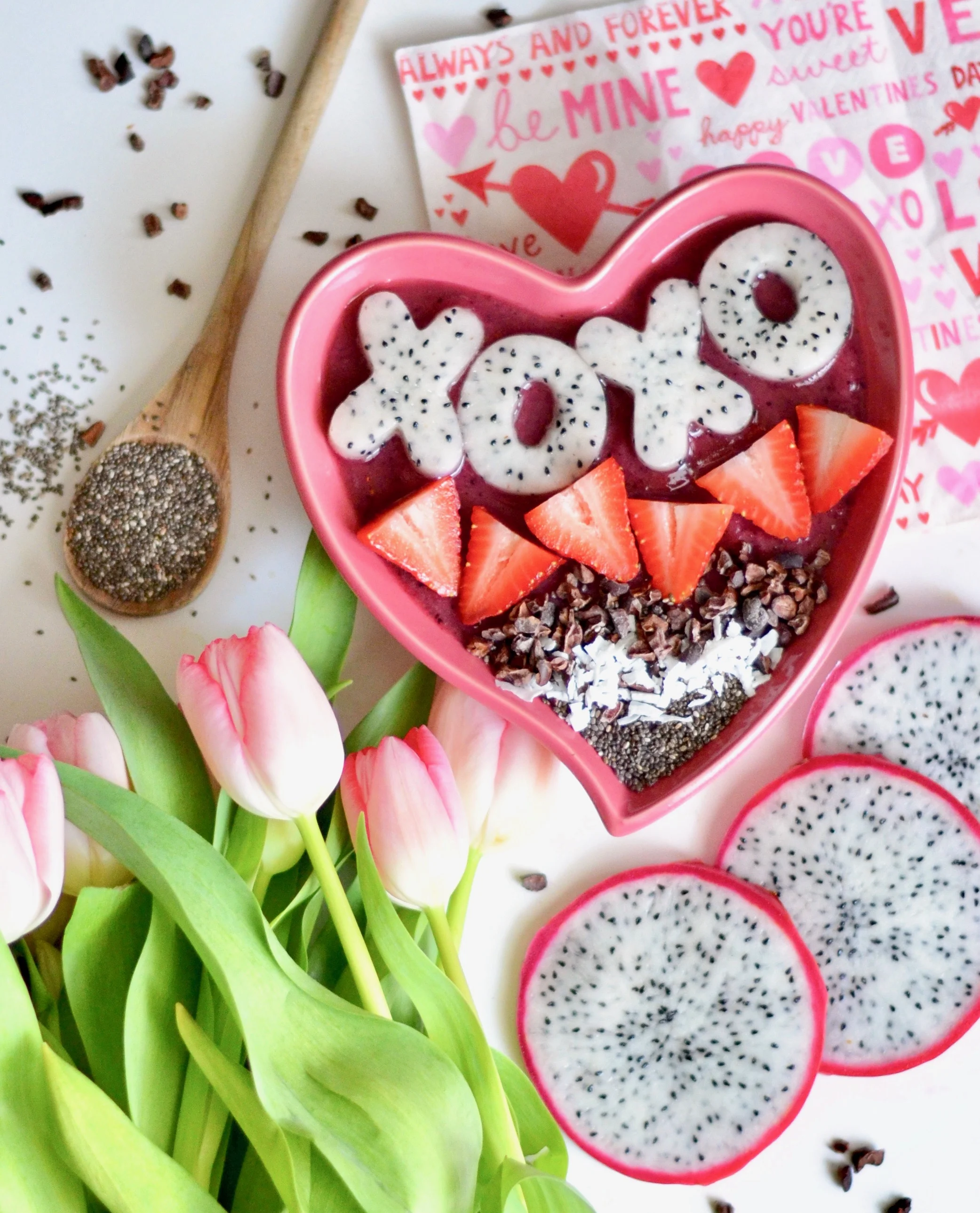 To prepare the smoothie, simply add of the ingredients to a blender and pulse until smooth. Next, pour the smoothie into a bowl and for this recipe, I used one of my favorite heart-shaped bowls! Using an 'X' and 'O' cookie cutter letter, I cut out 'XOXO' from dragonfruit and added them to the smoothie. I also added fresh strawberries, raw cacao nibs, shredded coconut, and chia seeds.