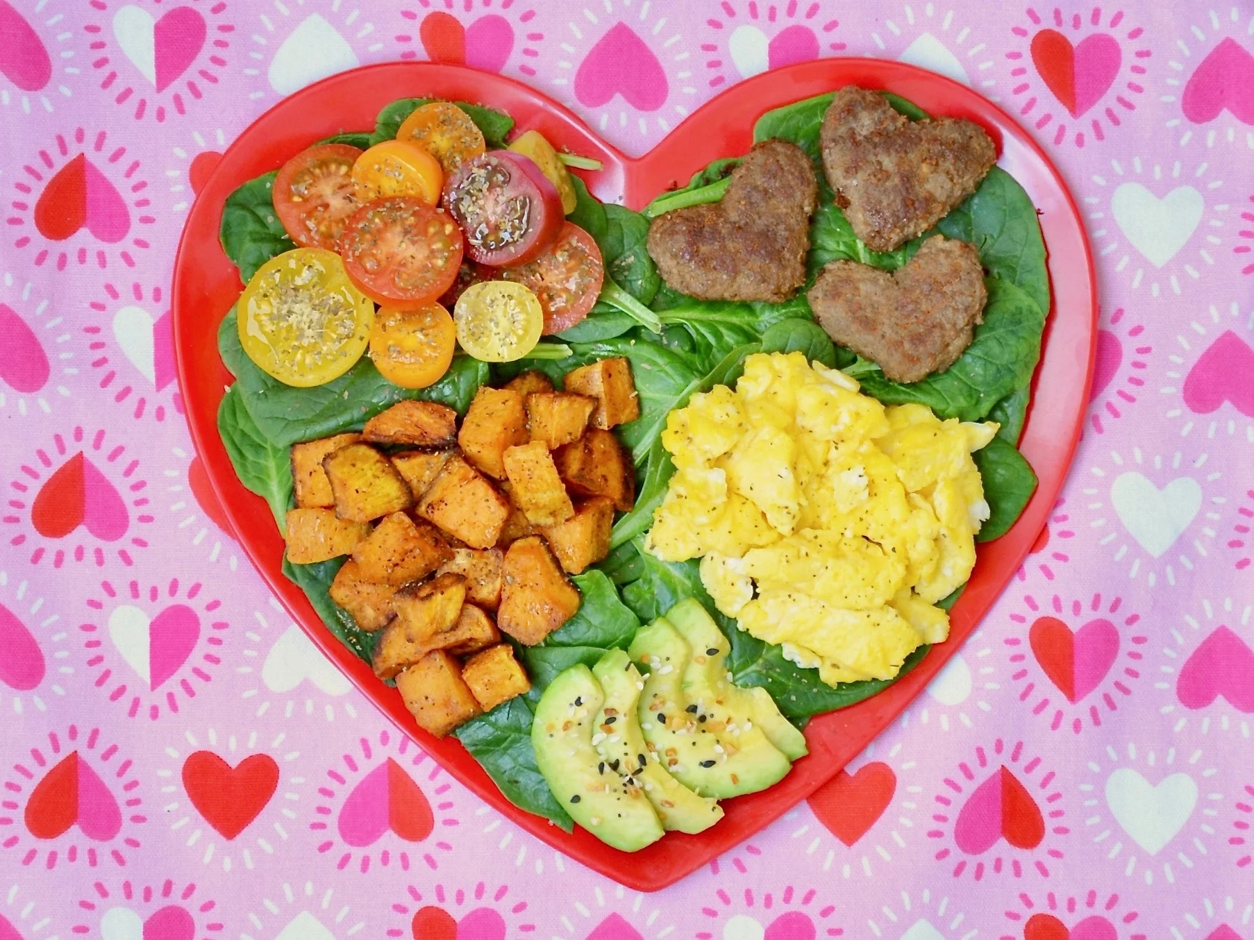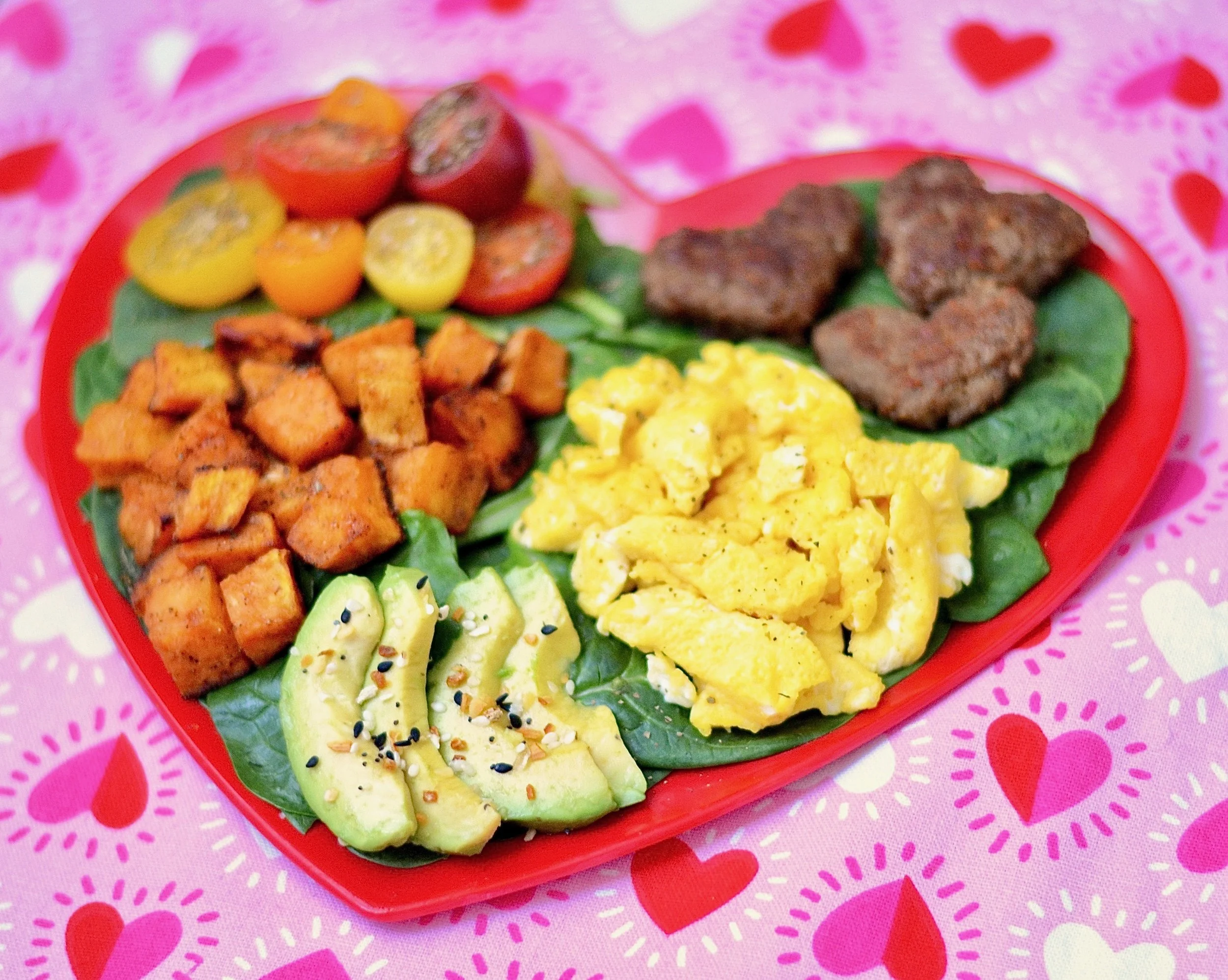 Begin to prepare the breakfast plate by adding a large handful of spinach to a plate (of course I used a heart-shaped one). Add the turkey sausage hearts, scrambled eggs (with an extra little bit of pepper), avocado (with a dash of 'Everything but the Bagel' seasoning) sweet potatoes, and tomatoes (with a pinch of basil).