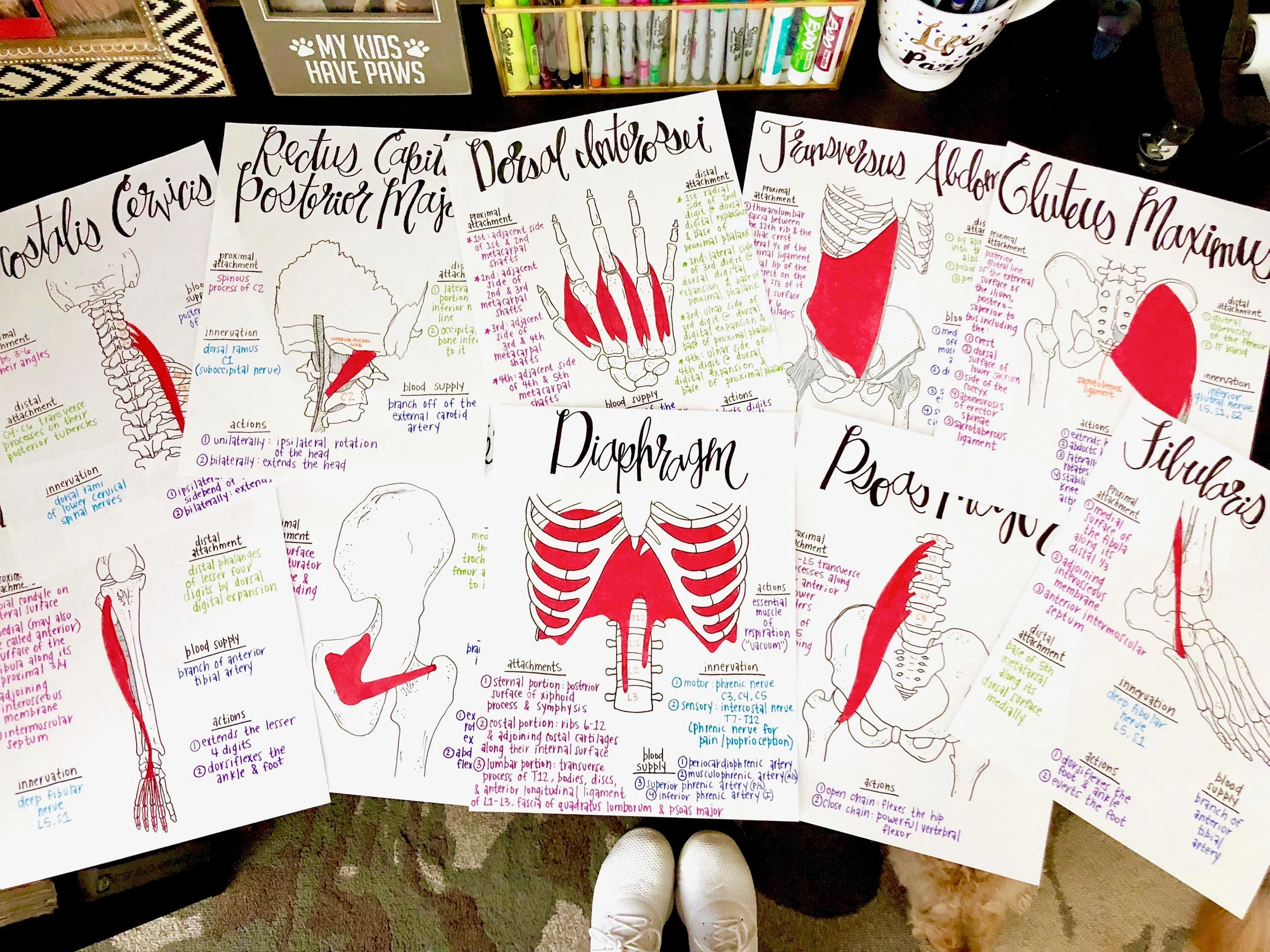 Hi everyone! So, if you are a visual learner like me, then you know that learning all of the muscles in the human body can be a daunting task if you don't have visuals to aid in your studying. I spend a lot of time in the cadaver lab and in osteology lab (with skeletal models) to learn all of the different muscles and bony structures one-by-one. Additionally, since I learn best with pictures and colors, I have drawn out 155 of the major muscles in the body. Resources like Netter and Human Anatomy Atlas have wonderful illustrations and I reference them often, but they do not isolate individual muscles. Most illustrations in anatomy resources have groupings of muscles, making it difficult to understand the origins and insertions when you can't actually visualize them because they're crowded with all other muscles present in that region. This is why I created these drawings that showcase one muscle at a time! As a visual/tangible learner, drawing and writing things out myself helps me grasp information the best. This has helped me SO much because when I am recalling the information, I can visualize vivid images of the colorful drawings I made and make sense of everything there is to know about a muscle.
