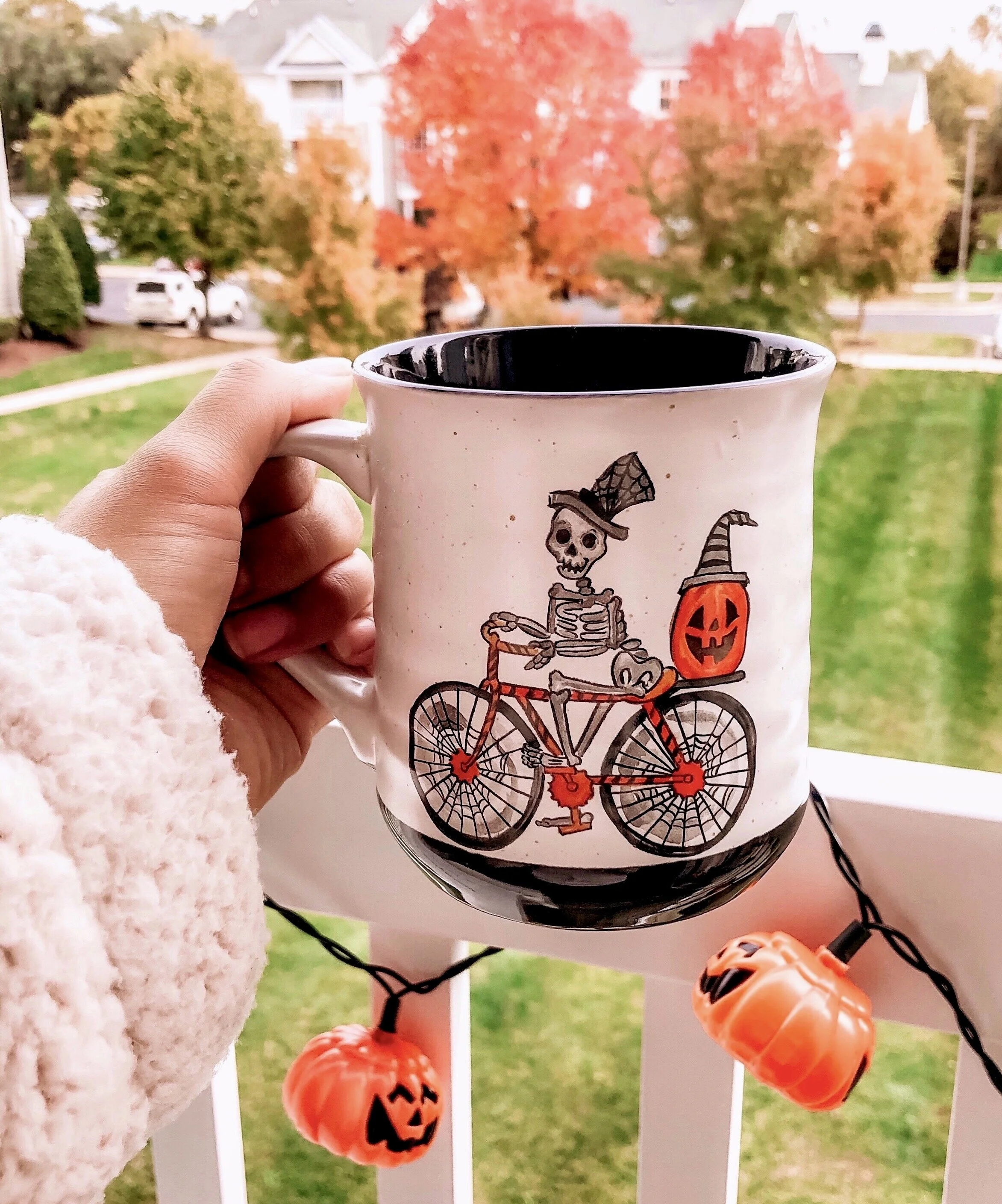 Alright y’all… I couldn’t help myself with this mug. How adorable is it?! A skeleton riding a bicycle with a pumpkin tagging along for the ride?! Ugh… yes please. Come to mama. I got it from TJ Maxx for just $2.99 and drank out of it pretty much every day for the whole month!
