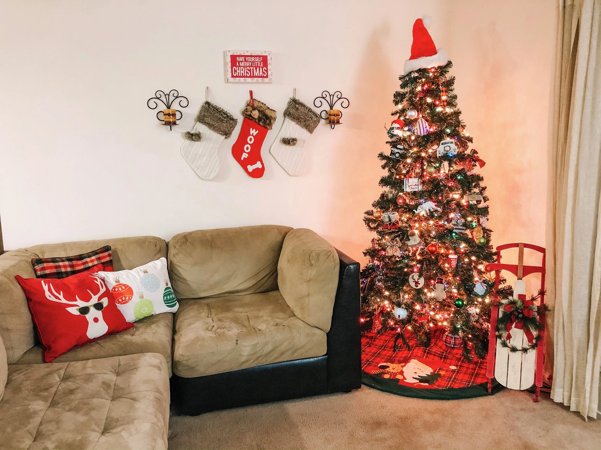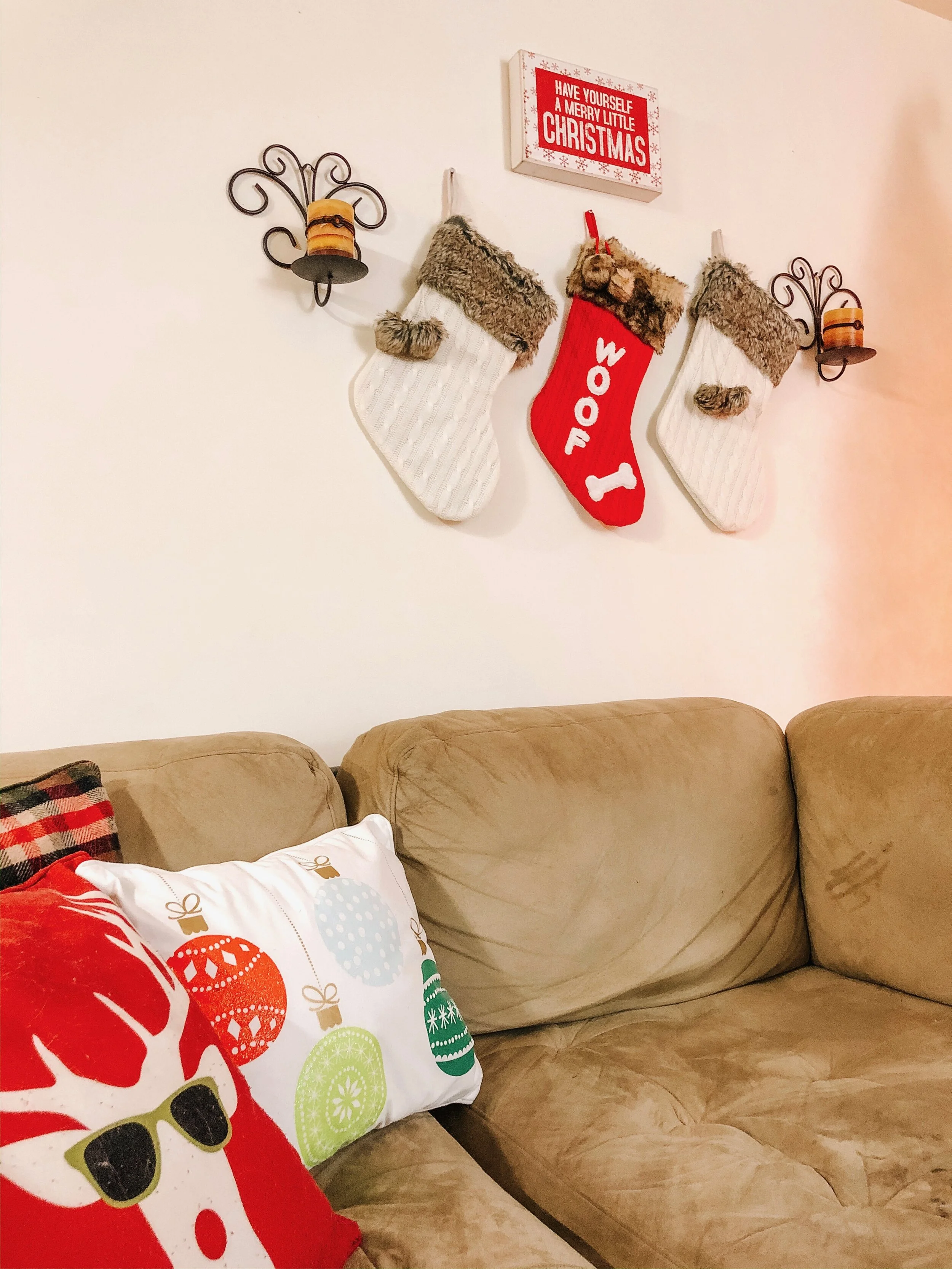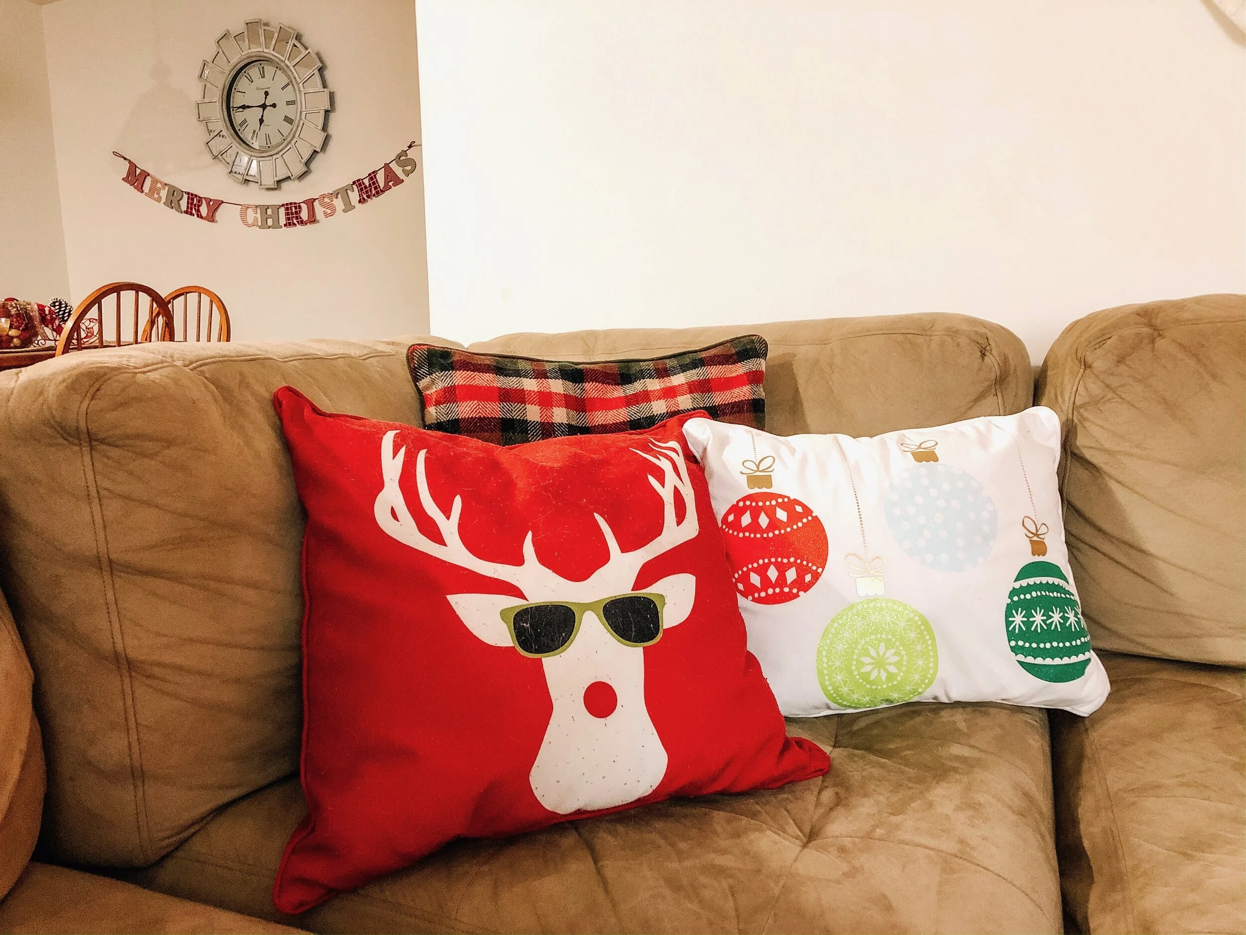 The perfect piece to deck the halls! This plush velvet Christmas ornaments accent pillow from Kirkland’s is such a festive new addition to my Christmas decor. I’ve had the other two pillows for a few years - the plaid one is from Michael’s and the reindeer one is from At Home. It bring such a pop of colorful cheer to my living room!