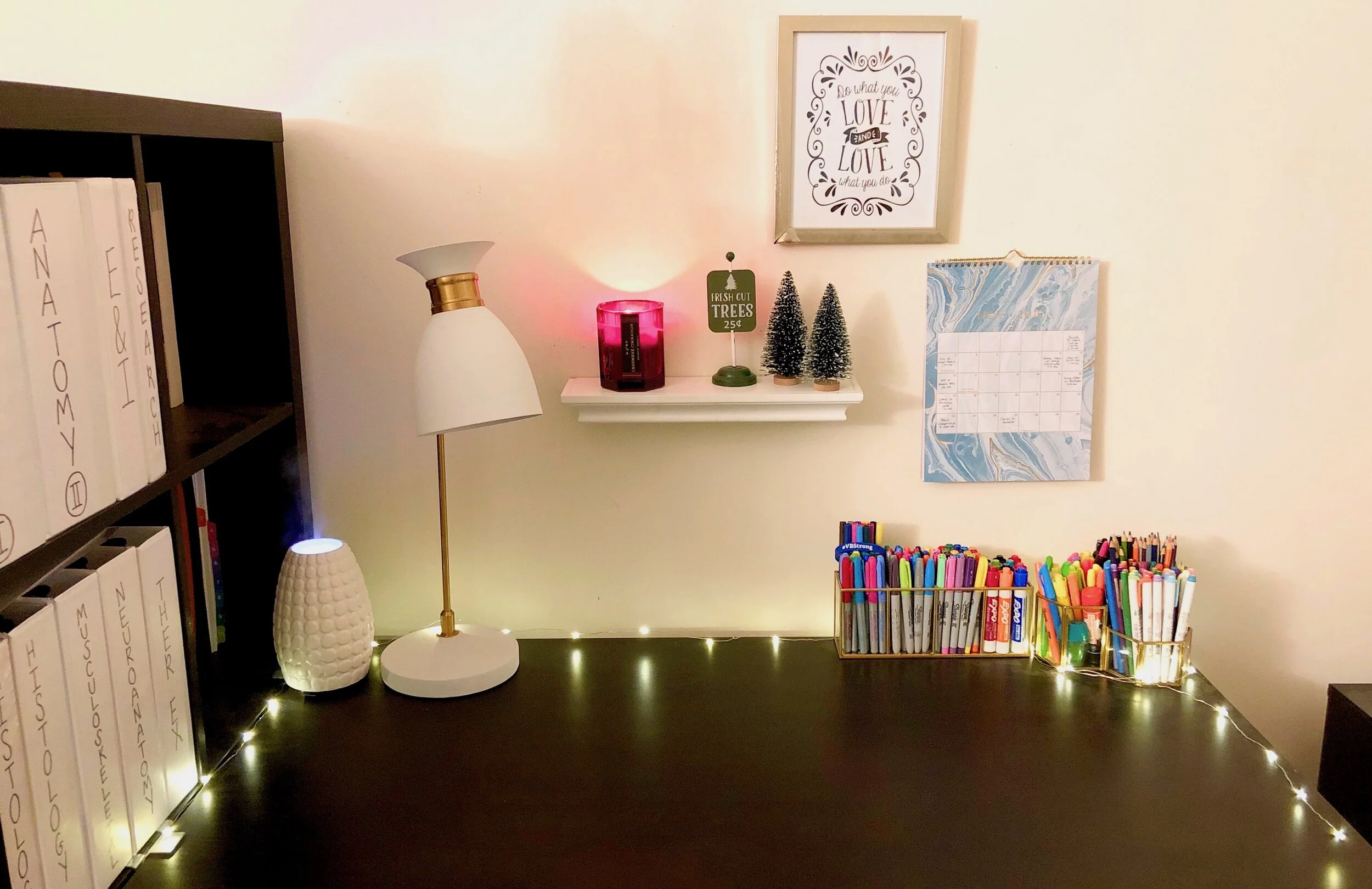 I found these fun, festive twinkle lights from Home Goods for just a few bucks and am so in love with them! They don’t have to be plugged in and are just connected to a tiny little power box that only requires one AA battery, which could easily be tucked away underneath my desk. It has a small power switch to turn it on and off (it can be put on a static setting or a twinkle setting). It’s really just a simple strand of twinkle lights, but adds such a cozy, festive touch to my desk!