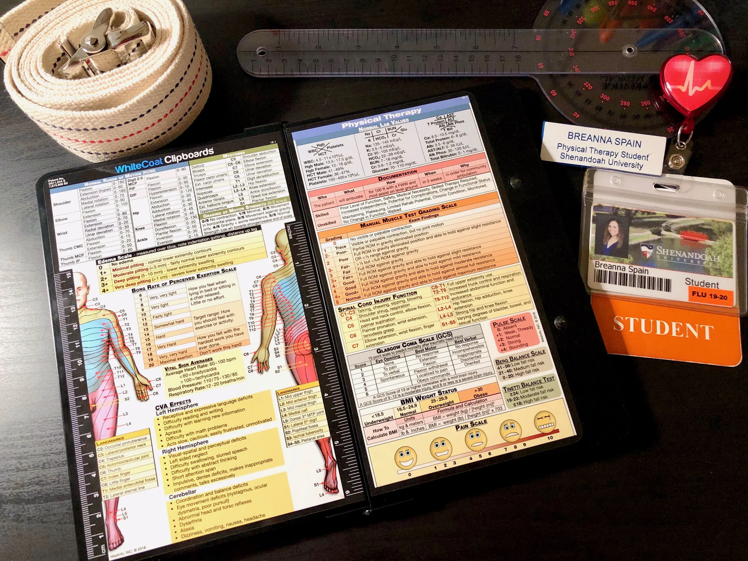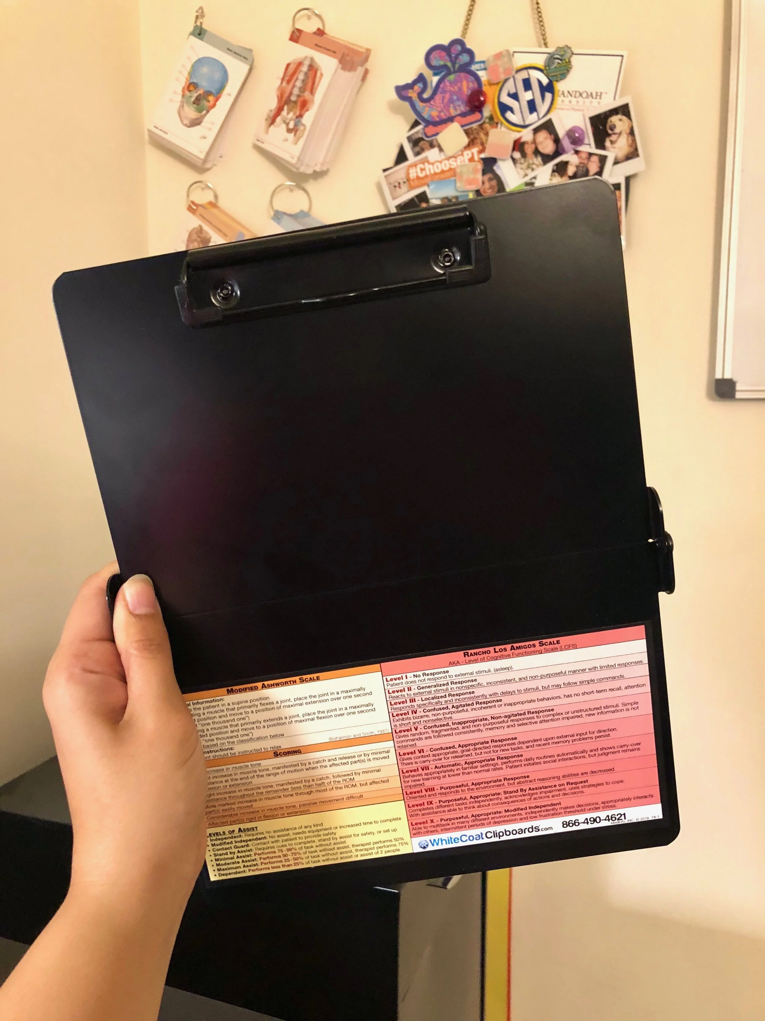 I’m so in love with this clipboard! It’s the perfect little handy tool to keep with you during class or at the clinic and includes essential reference information for both outpatient and inpatient settings. Here’s some of the things it includes: ROM, MMT, myotomes, RPE, BMI, bony landmarks, lab values, CVA impairments based on location, spinal cord injury classification, Glasgow Coma Scale, Rancho Los Amigos Scale, Berg Balance Scale, Tinetti Balance Test, Modified Ashworth Scale, and so much more!