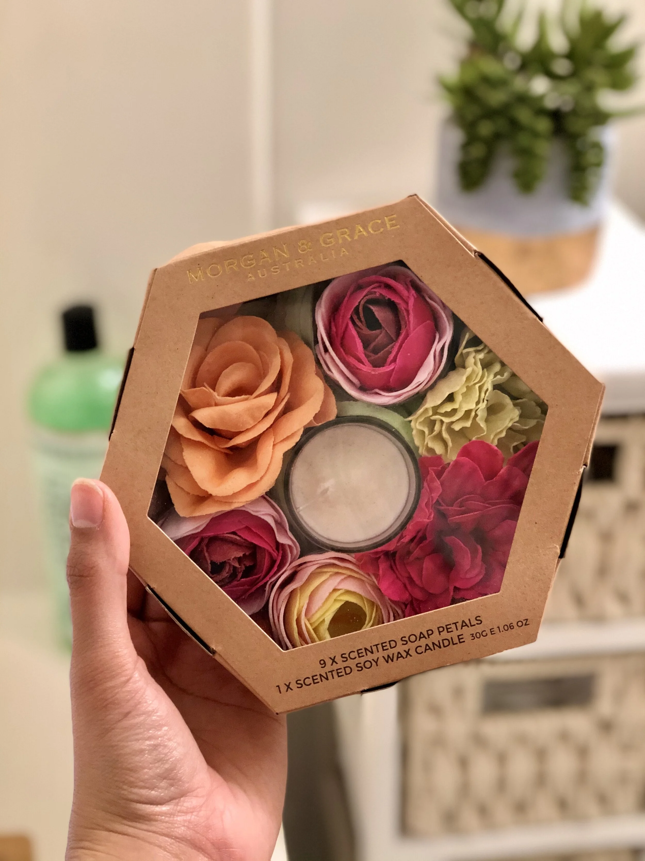 How adorable is this little set?! I found it at TJ Maxx for just a few bucks and it includes soap petals and a dainty little candle that are perfect for a super cozy bubble bath!