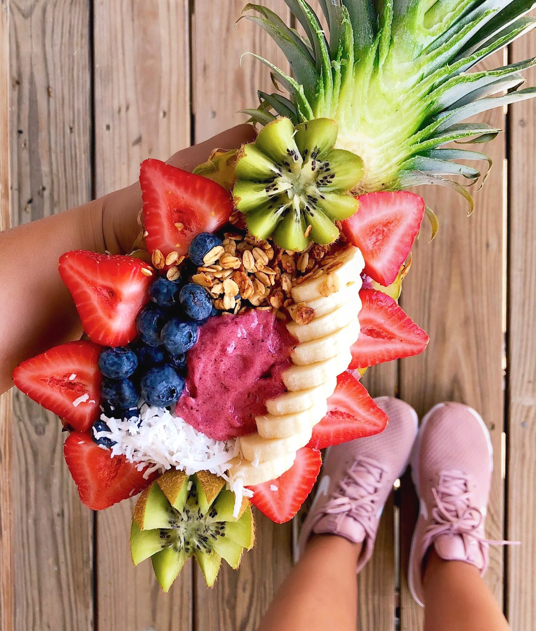 For my acai bowls, I use Sambazon frozen acai. I always add some form of fresh or frozen berries like strawberries, raspberries, blueberries, and/or blackberries. Bananas are a MUST because they give smoothie bowls so much flavor and extra creaminess! Other fruits I throw into the mix are some combination of pineapple, mango, kiwi, passionfruit, peaches, oranges, dragonfruit, and pomegranate. I try to add in at least a little bit of green to all of my smoothies and do so with the addition of spinach, kale, mint, avocado, cucumbers, spirulina powder, and/or moringa powder. Other yummy/nutrient-dense staples I use are oats, ground flax, ground chia, beet powder, pitaya powder, and protein powder. Last but not least, I polish it off with a scoop of my collagen powder + a tablespoon of MCT oil as a quick and easy way to get these important supplements in for the day.