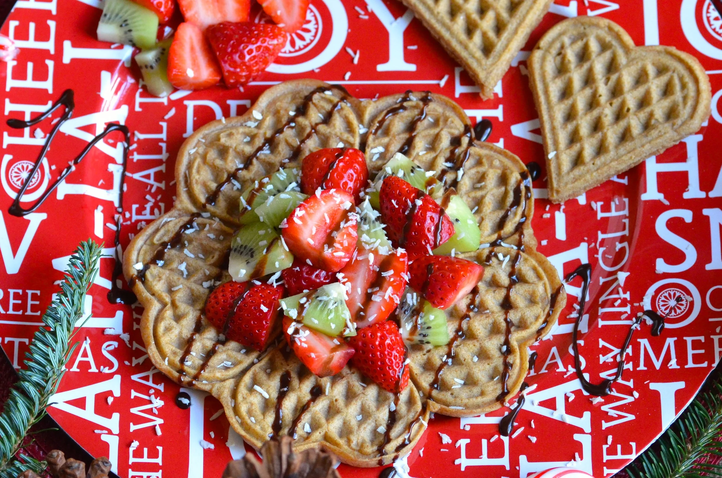 Christmas Waffles Topped with Fresh Fruit, Coconut, and Chocolate Sauce