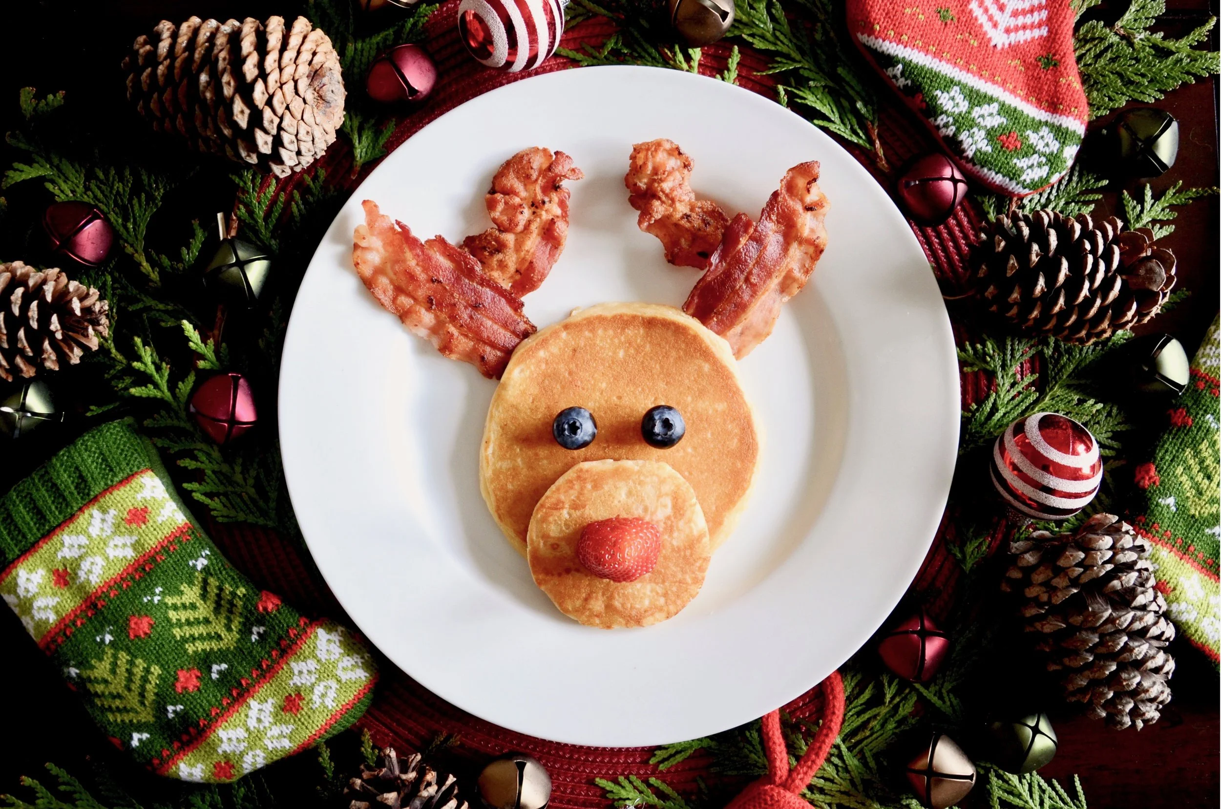 Christmas-Themed Rudolph Pancakes with Bacon and Fresh Fruit