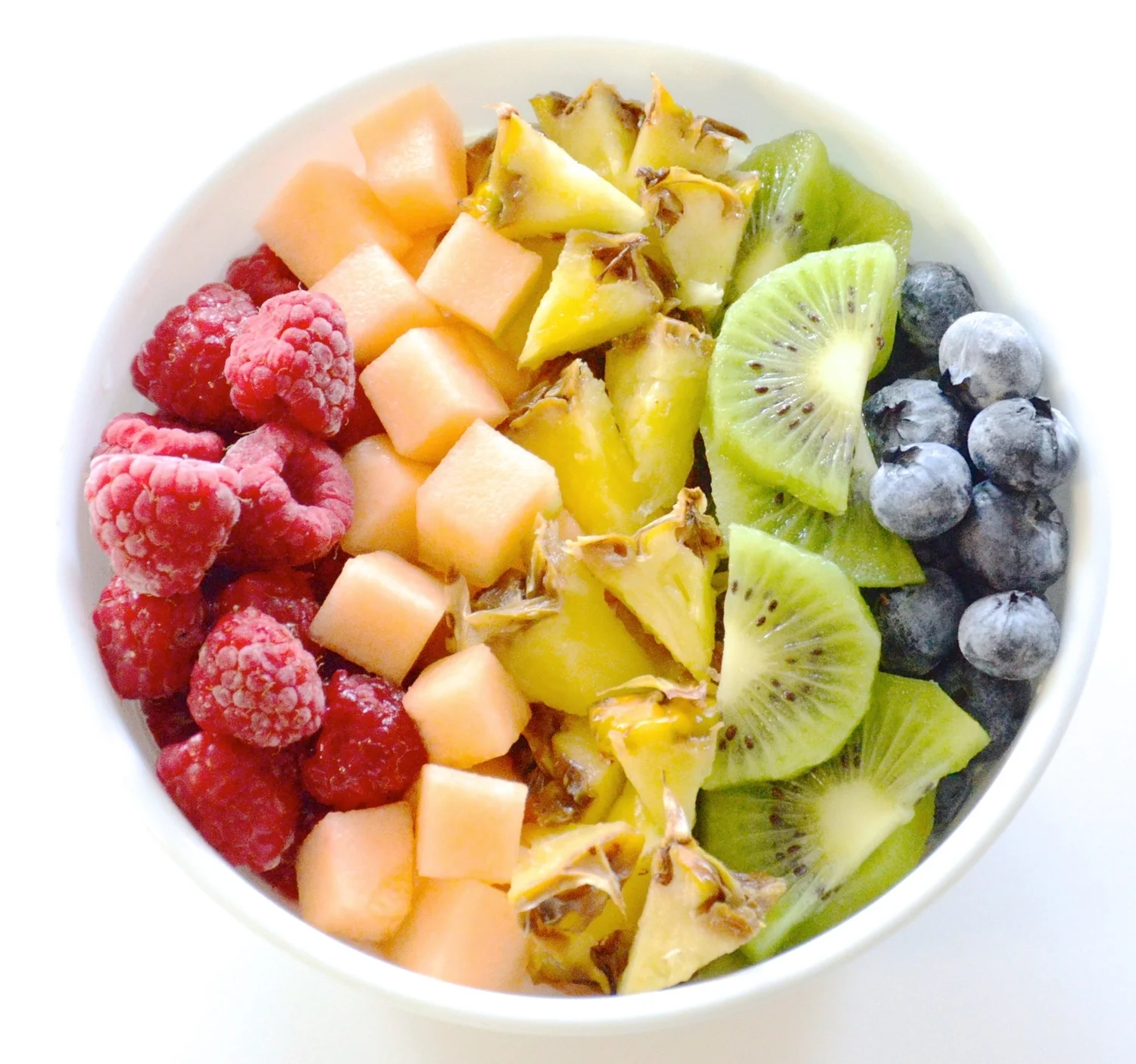 Add your yogurt to the bowl. Then, wash and chop your fruit (if necessary). Add them on top and if your fruits are the same color as mine here, it only makes sense to arrange them in ROYGBIV (rainbow) order - yay for prettiness!