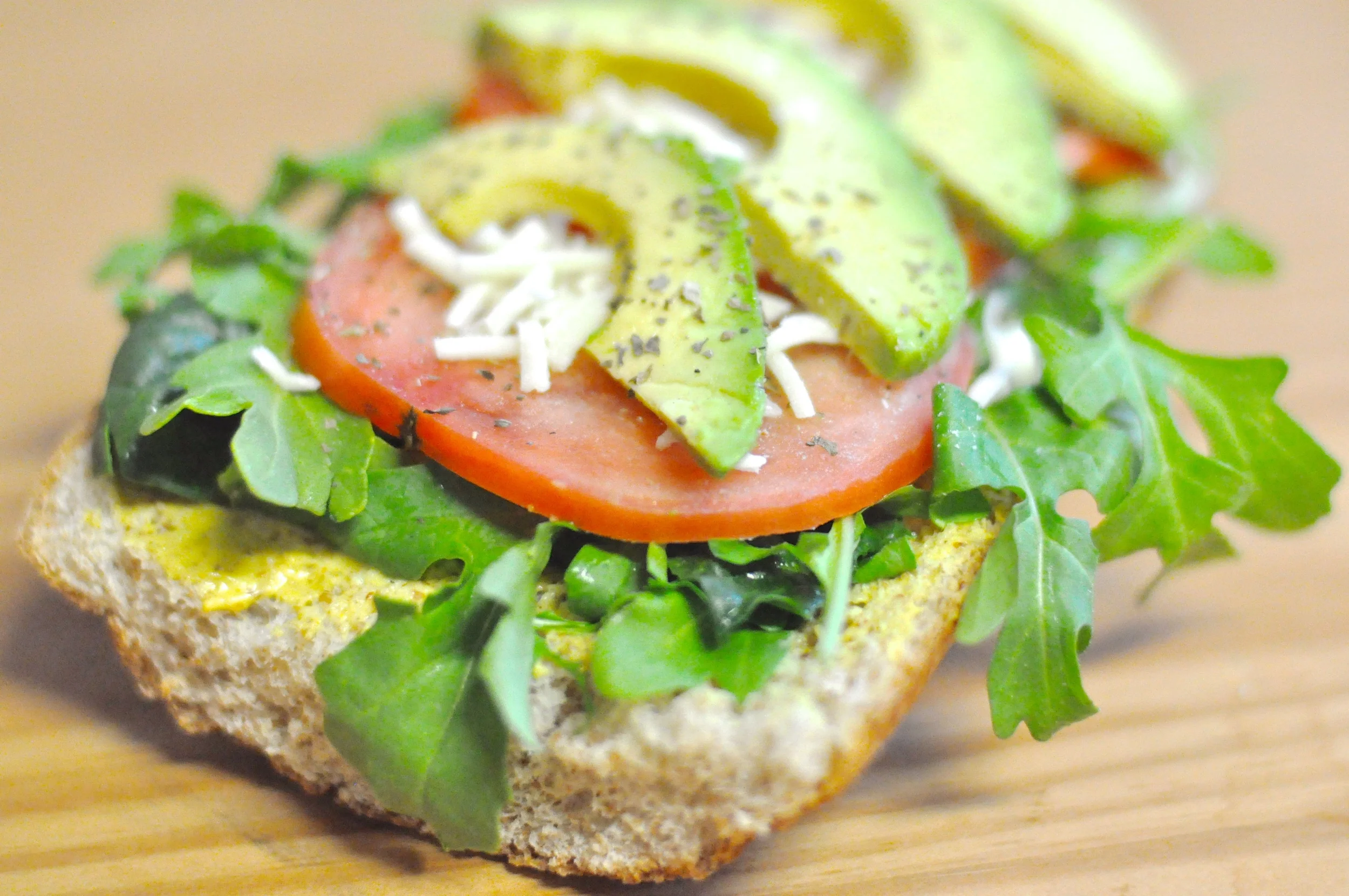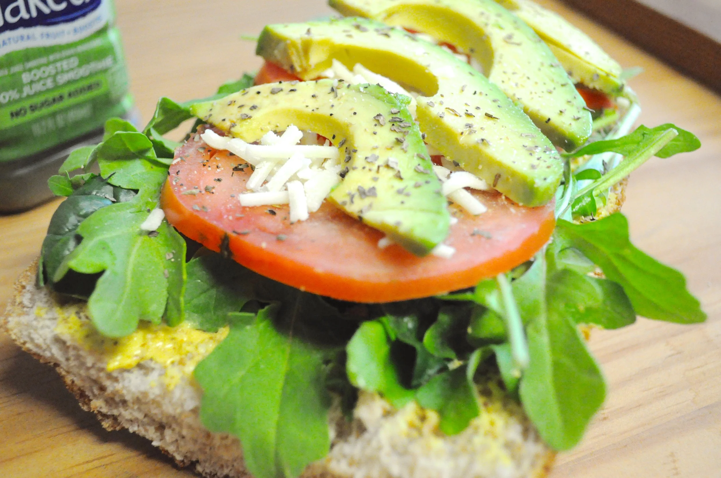 Toast one slice of a baguette. I added a light honey dijon mustard. Make sure you wash your leafy greens thoroughly then add them to the sandwich. Then, top it with your tomatoes, mozzarella, avocado, and a dash of salt pepper!